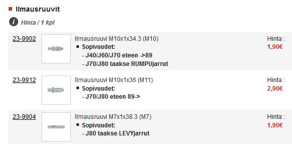 HDJ 1990 takasatulan ilmausruuvi ongelma. Vaihdoin uudet Motonetin ilmausruuvit taakse ja ne ovat varmaan kuvan eka malli 23-9902. Ongelma on että vaikka kääntää ruuvin kuinka pohjaan vaan niin nesteet lentää läpi. Onko tuo 23-9912 malli sitten jotenkin erilainen ja sopiva? Toinen vaihtari on tietty että olisi jotain likaa välissä ja vuotaisi siksi. Vanhat ruuvit meni jo roskiin joten en pääse vertailemaan. M7 se ei ainakaan ole, en tiedä missä mallissa tuollaista olisi? Uudet satulat on tulossa mutta pitäisi saada auto nyt pikaisesti ajoon.