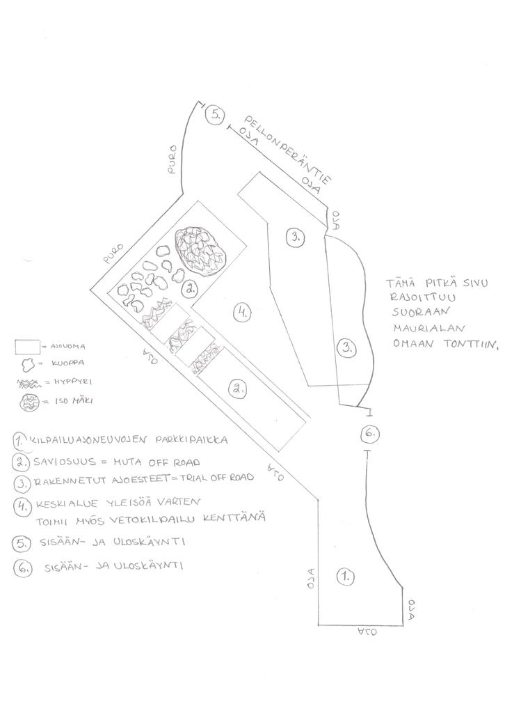 Alue on 1,5 ha ilman tuota alareunassa näkyvää parkkipaikkaa. Parkkipaikan kanssa hieman alle 2,0 ha. Piirustukseen on saviosuus piirretty kokonaan sen vuoksi että se on jo karkeasti rakennettu. Trial osuus on tyhjä kun sen tarkkaa sisältöä ei vielä tuossa vaiheessa tiedetty. Piirustus on mittasuhteiltaan liian "laiha". Eli esim. yleisölle tarkoitettu keskualue on käytännössä huomattavasti leveämpi. Isossa maailmassa ei varmaankaan kelpuuteta tällaista asemapiiroksen irvikuvaa, mutta maaseudulla tuntuu olevan eri meininki.:o http://forums.offipalsta.com/picture...ictureid=76342 Yleisön ajoneuvot ohjataan viereiselle pellolle. Yleisö tulee alueelle jalkaisin. Yleisöalue tullaan siimoilla rajaamaan keskualueelle josta on hyvä näköala joka suuntaan. Tällä tavalla minimoidaan ikäviä kontakteja kilpa-ajoneuvojen ja yleisön välillä. |