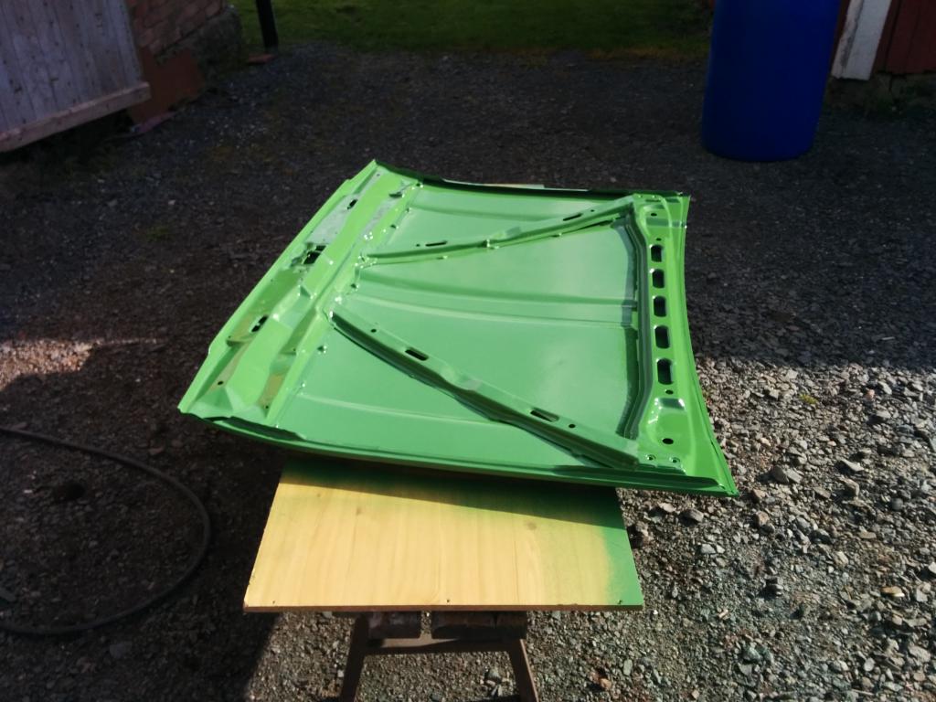 Tänään oli taas mukava myrsky mutta sain konepellin ja ovien sisäpuolet maalattua. Konepellin väri on vielä vähän auki kun vois mustakin näyttää ihan hyvältä tossa ettei tulis liian vihreetä.. :confused: :rolleyes: