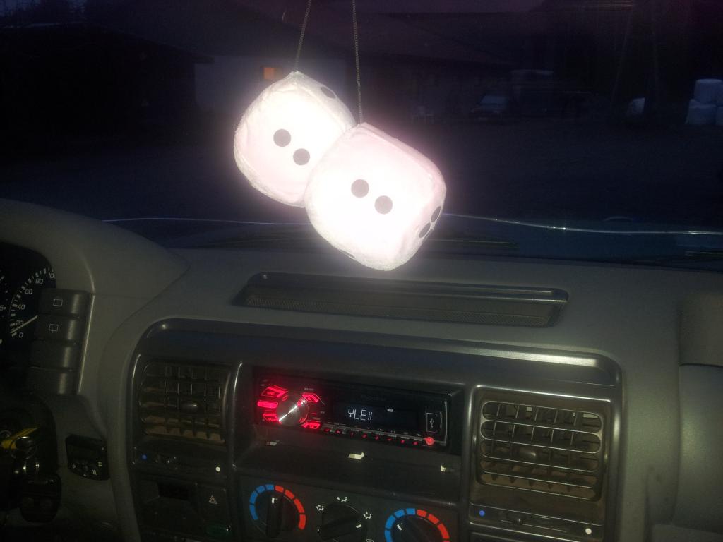 Paskoja autoja nämä lantikat, nyt hajosi sisäpeilissä roikkuvat nopat. Onneksi näppäräsorminen tytär korjasi ne hetkessä.