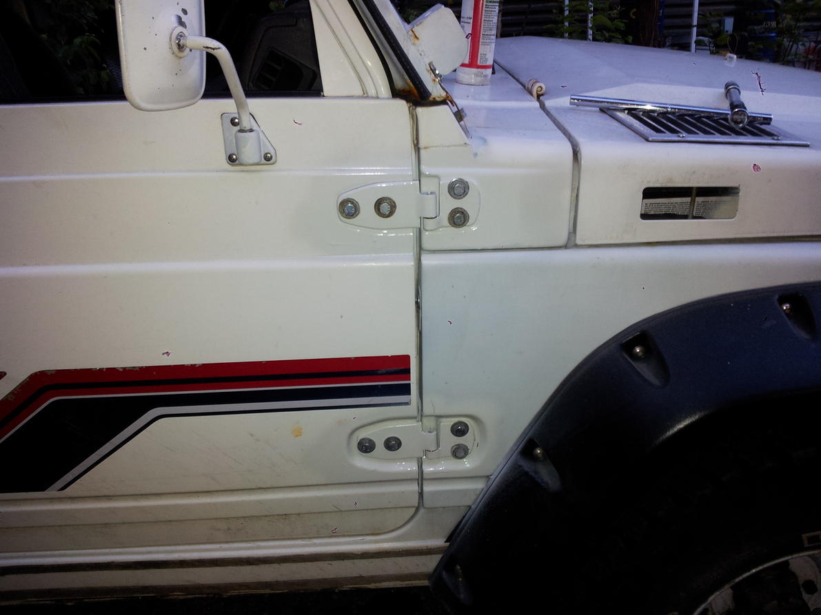 Eilen oli ylimääräistä aikaa, joten lopputuloksena on jotain seuraavanlaista: http://forums.offipalsta.com/attachm...6&d=1343976700 Ovet ja saranat irti http://forums.offipalsta.com/attachm...7&d=1343976714 Ruostetta ja metallia pois saranoista. Saranassa tappi on toisesta päästä hitsattu ja toisesta vain puristettu kiinni, joten laikkasin puristetun pään irti. http://forums.offipalsta.com/attachm...8&d=1343976735 Tappia lyhensin sen verta, että tappia on vielä joku 20mm jäljellä. http://forums.offipalsta.com/attachm...9&d=1343976762 Laitoin vielä prikat saranaan, niin liukuu herkemmin. http://forums.offipalsta.com/attachm...0&d=1343976781 Koko hommaan meni maalailuineen kaikkineen joku reilu tunti+maalin kuivumiseen muutama tunti. Rajoitinremmit käyn ensi viikolla Tattarisuolla jollain verhoomolla kasauttamassa. Sneaky preview kuvia ei ole, mutta materiaalina on Swiftin turvavyö ja 2mm rosterista leikatut käikäleet:) |