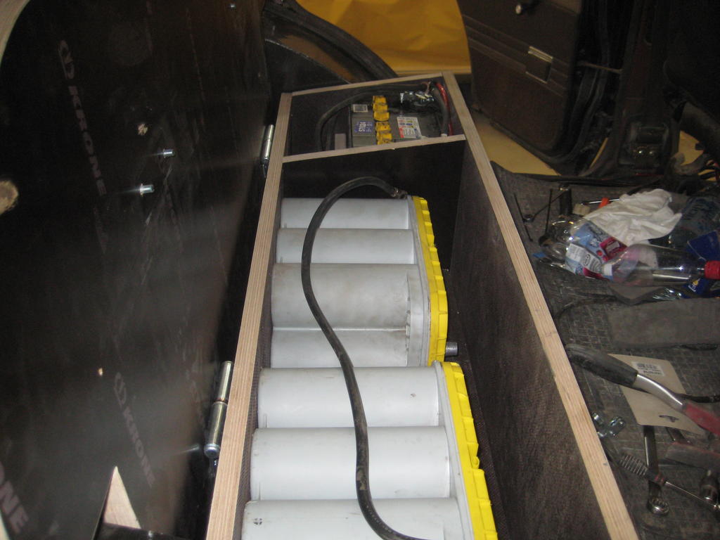 akut otin pois keulalta ja laitoin ne kaikki takapenkin alle.samalla värkkäilin istuinosaa hiukan taaksepäin niin sai ruhtinaalliset limojalkotilat. kotelon värkkäsin vanerista ja istuinosa on saranalla.selkänojaa täytyy saada vielä hiukan kallistettua kun on olo kuin kirkonpenkillä istuessa.