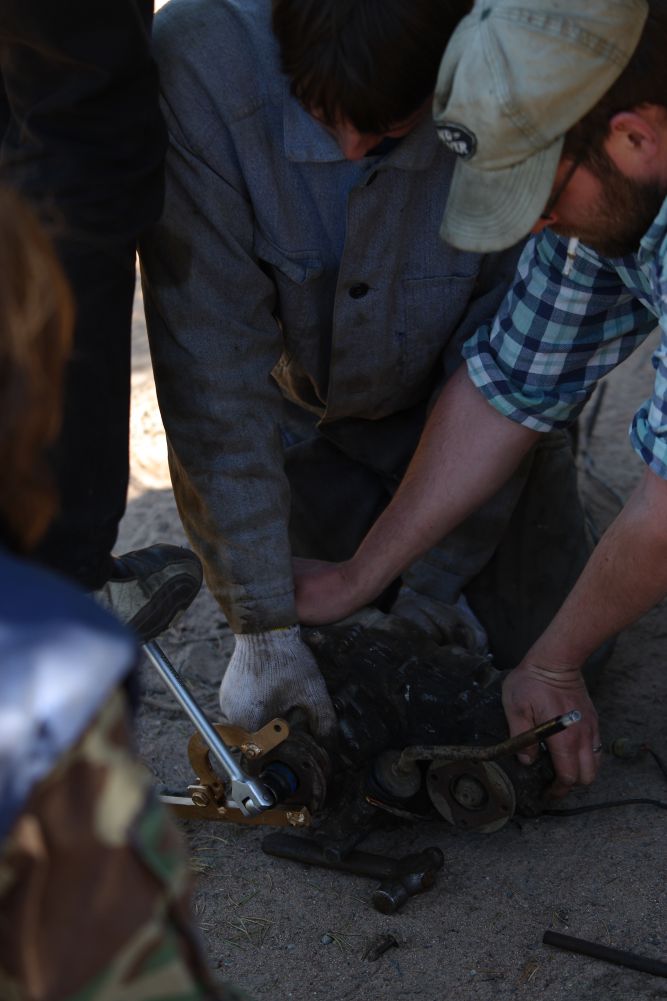 Peten ja Kankun eilinen pinionin laakeririkko oli osoittautunut vain pelkäksi löystyneeksi pinionin laipan pultiksi. Tämän päivän haasteena on pikkusen turpaansaanut moottori, oli kuulemma just&just suzuki jaksanut nousta pienen puolen ykkösellä tralerille. Öljyt ja vedet sekaisin ja molempien sekoitusta tulee pihalle pakoputkesta. Pojilla edessä moottorinvaihto ennen huomista jatkoa. |