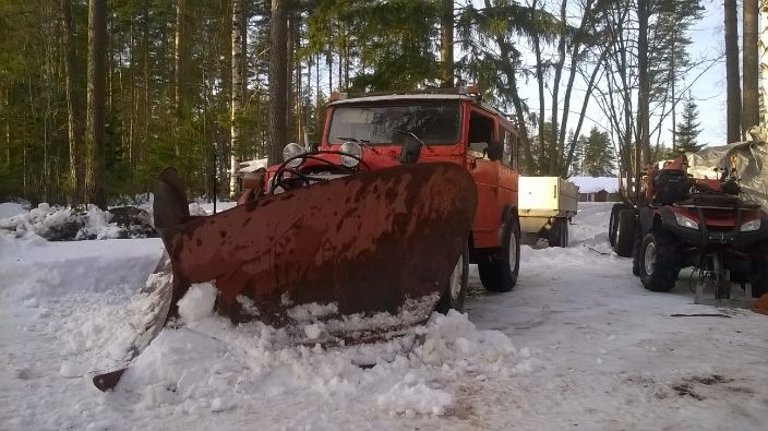 Olis helppo siirrellä katolta tippuneita lumia poijes ja tekishän sillä paljon muutakin. Joku tällainen systeemi. En ole tehyt, suunnitellut monestikkin... Mutta ongelmana tuossa on se, että maasturin etupäätä ei hirveä kuormittaa kovinkaan paljon. Siis tuohon kauhaan, ja sen painovoimaiseen kippaamiseen pitää laittaa semmoiset varret, että kauhaa saa nostettua ainakin puolimetriä ylöspäin, jos meinaa kipata kasaan, niin vähintään tuplat. ja kun tuo kauha tulee puskulevyyn verrattuna kokonaan levyn etupuolelle, niin myös lumikuorma on kaukana, siis noin 1,5-2 metriä etuakselista, ja jos kauha painaa esim. 50 kg enemmän kuin puskulevy, ja siihen mahtuu 100 kg lunta, niin lisäpainoa on jo 150 kg, ja se on puskulevyä kauempana edessä. siis etuakselille painoa aika paljon lisää... Jos etuakseli/runko/jouset kestää, niin mikä ettei, varsinkin jos tavotellaan kolaa pikkaisen tehokkaampaa... Mulla on n. 3500 kg takavetotraktorissa hydraulinen takakuormaaja ("renki-" merkkinen) ja siinä n.2 metriä leveä, n. 50cm syvä ja korkea peltinen kauha, ja kun ottaa raskasta lunta kauhan täyteen, ja työntää taakse kippausta odottamaan, niin etuakselilta vähenee paino niin paljon, että kääntöjarruilla joutuu avittamaan peruutettaessa penkkaan... ja siis normi maatilarenkailla, ei ketjuja eikä nastoja. |