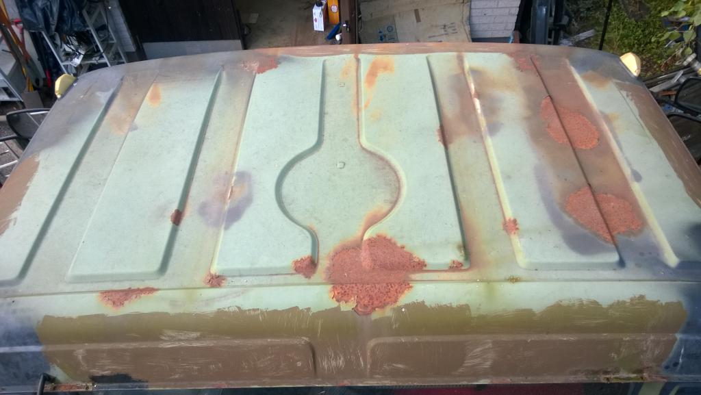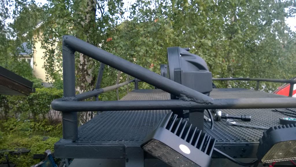 Katto oli päässyt tuollaiseksi ja sille piti jotain tehdä, ennen kuin vedet vuotaa sisään. http://forums.offipalsta.com/picture...ctureid=161033 Tuommoinen siitä sitten tuli, kunhan pari ylimääräistä maalausta tuli tehtyä, ukkoskuuron välillä pilattua hommat... http://forums.offipalsta.com/picture...ctureid=161034 Kattotelineen kun joutui punnertamaan pois, niin samalla se piti maalailla ja vähän muokata. Aiemmin oli lisäpitkät sen etureunassa, mutta ne valaisi ikävästi kojelautaakin, niin nyt sitten sen korjaus samalla. http://forums.offipalsta.com/picture...ctureid=161035 http://forums.offipalsta.com/picture...ctureid=161046 Tässä sitten maalaamo... http://forums.offipalsta.com/picture...ctureid=161036 Ja huippumaalausolosuhteet, väkisin meinasi vettä roiskua... http://forums.offipalsta.com/picture...ctureid=161037 Tuommoinen sitten tuli. Tarpeeksi ruma, niin ei turhaan kaunista autoa. :) 3,10 m piti nyt kirjoittaa auton korkeudeksi ilman koppia, kojelaudan tarraan. http://forums.offipalsta.com/picture...ctureid=161038 Noin kauas piti valot laittaa, että eivät varmasti kojelautaa valaise, kun sen verran isot. Biltemasta valkkasin ne mallit, missä HID polttimoillekin hyväksyntä umpiossa, jos semmoiset vaikka joskus tulisi mieleen viritellä. Jaa, noi etuviistoon näyttävät työvalot kanssa päivitin n. 3 x tehoisiksi, mutta näkeepä joskus pimeellä, onko ne sen verran enemmän valaisevat. Ei ainakaan hinnalla pilattu enää ollut Puuilossa nuo 48 W mallit. http://forums.offipalsta.com/picture...ctureid=161039 |