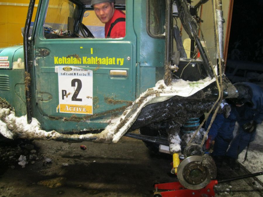 Mukava kun sai tuosa nukuttua semmoset 14h nyt alakaa voimat palautuun ja arki koittaa. mutta olihan se hienoa aloittaa kausi voitolla. Ainut miinus oli että yksi pahimmista kilpakumppaneista se "voittamaton" volvo lopetti leikin kesken kisan :( no jos sitä paratiisin mennesä saatas kerättyä taas jonkin verran kolehtia kasaan että saatais auto nippuun ja päästään kisaan mukaan. Kiitos jennylle joka tarjosi meille kisan alussa kahavit (hyvä budjetti kaudelle kun se on loppu jo ennen ensimmäisen kisan lähtöä =)) ja iso kiitos team willelle että kustansit meijän kisa porukan rahattoman ruokailureissun :) (tarra paikka jostain kaariputki hässäkästä on nyt sun):D Auto kesti taas kerran melekosen hyvin, naru katkesi viisi kertaa ja renkaisiin puhallettiin joku kerta henki takas sisälle. Kalustovaurioita tuli sen verran, että kaikki puslat tukivarsista ja panhardista on kaput ja se hammaspeikko joka iski kutosalueen metsikössä portaalipoksiin ja rengas välillä sutissa nilkutimme ratti sutaten maaliin.:D( kiitos tsemppaamisesta lalli bj ) iso kiitos team ojalalle joka oli kaverina tunnin meitä vinssaamasa siittä lervamontusta pois, ilman teitä oltas sielä vieläkin.:D Se rasti jossa sai puusta vinssata jäi kyllä kismittään. Ei ylettyny bj rastille :eek: ja lopuksi ISO kiitos omalle tiimille eli matille ja markolle ja tietenkin koko huollolle joka pelasi jälleen erittäinkin hyvin!!!! Onnittelut kaikille sijoittuneille ja itsensä ylittäneille, etenkin Pyykkipojalle joka varmasti oli sijoituksen siitä meijän takaa ansainnut, hienosti veditte.:D Kiitos vielä kilpailunjärjestäjälle hyvästä ja toimivasta kilpailusta.