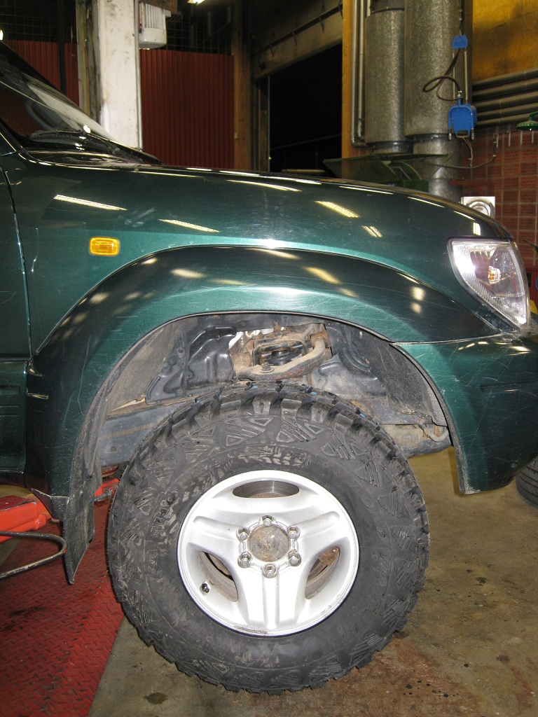Näyttää jo paljon paremmalta noinkin, kuten huomaat 285/75 kumeilla olis tarvinnu lähtee silpomaan kuraläppää/muokkaamaan sisäloksua. Pidemmillä jousillakin se sisäänjoustossa ryystäis yhtä syvään. Korikorotuksella saa paremmin tilaa. Ja tukivarret maksimiin (casteria) säädettynä saa sentin lisää läpän väliin. |
