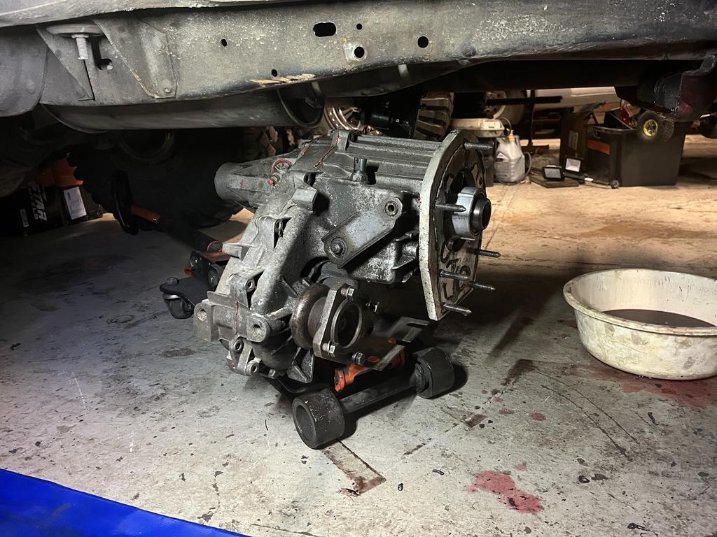 No päivitetääs tätäkin välillä. Jakolaatikko tuli hommattua kipolta ja ehjähän se on näiltä osin. Avasin kuitenkin sen akselin vaihtoa ja tarkastusta varten ja huomasin että tossa vanhassa laatikossa oli nelivedon ketju selvästi parempi, joten vaihdoin sen paikalleen. Samoin "öljypumpun" ratas oli jostain syystä halki, joten se vaihtui myös. Ja lopuksi kiinteää yokea varten muokattu ulostuloakseli omasta laatikosta paikallee ja pääs kasaamaan laatikon.