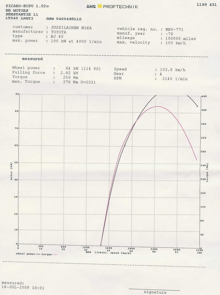 Vakiona 3B koneteho 90 heppaa ja 215 Nm. 3B + patrolin turbo@0.7 bar + omatekoinen pakosarja + välijäähdytin + 2.5" putki, 37 boggereilla takapyörätehoa 114 heppaa ja 376Nm Melkosta rengasmeteliä penkissä -> http://forums.offipalsta.com/picture...ictureid=35362 |