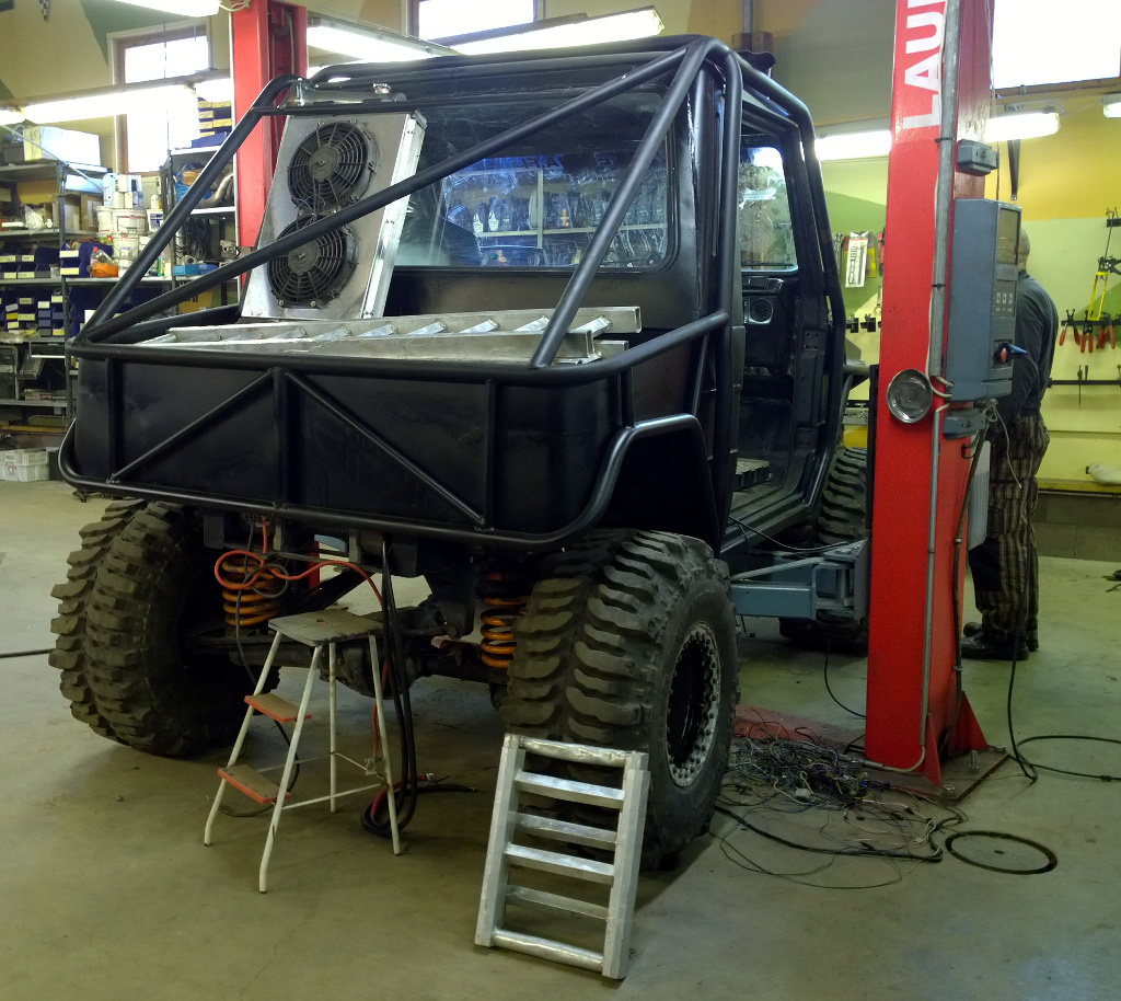 Hyvinhän me ehdittiin saada auto kasaan ennen Vihannin kisaa, joka onkin näköjään peruttu. Ei muuta kuin peukaloita pyörittelemään ja odottelemaan... Totta puhuen vielä uupuu ainakin lisävaloja, latauspistokkeita, karttatelinettä, ovien keventelyä(?), etulukon korjaamista, maastotunkin kiinnikkeitä, tavaratelineitä yms yms yms. Voiton puolella kuitenkin. Ei olisi tarvittu kuukauden lisäaikaa. |