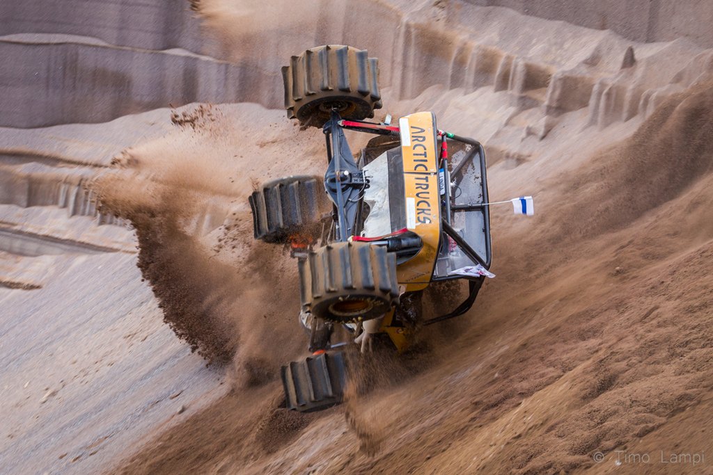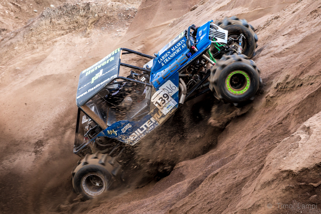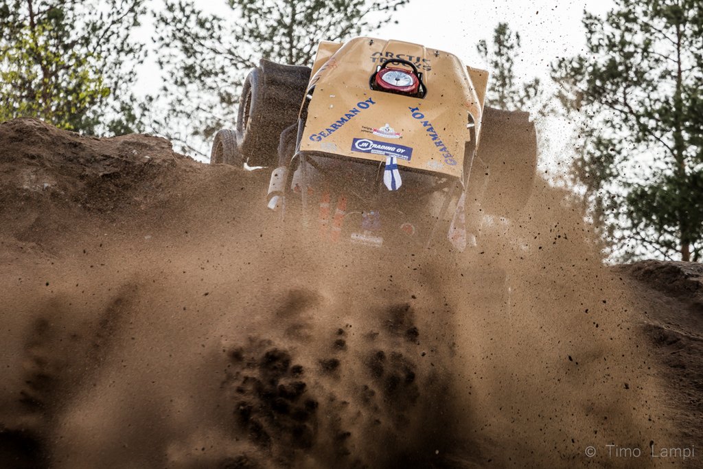 Nuo FOFF- vehkeet pöllyttää hiekkaa niin armottomasti että lyhyehköilläkin valotusajoilla saa ihan kohtalaisesti otettua noita pöllähdyksiä. Paremmalta toki näyttäisi vaikka jollain 1/100- 1/250sek. valotuksella, olisi tuo hiekka vähän "pehmeämpää" pölyä, mutta menee sitten jo kohtuu vaikeaksi kohteen seuraaminen niin että auto pysyy terävänä kun nuo kuitenkin pomppii aikalailla. |