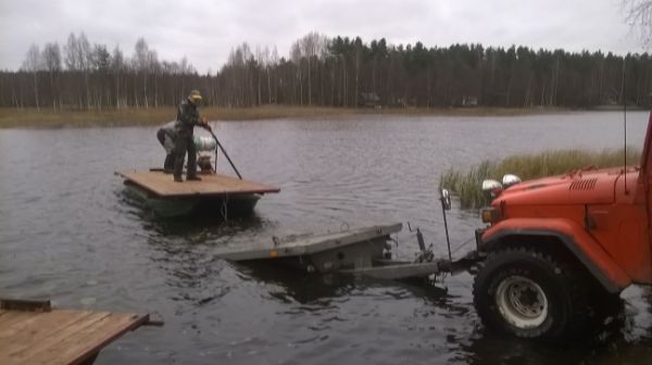 Toisen lautan kanssa meni hieman painiksi kun kärri tarttui johonkin pohjakiveen. No veturi irti,ympäri,vinssistä varppi koivuun,vetoa ja hop,koko pötkö kuiville... |