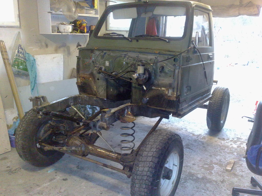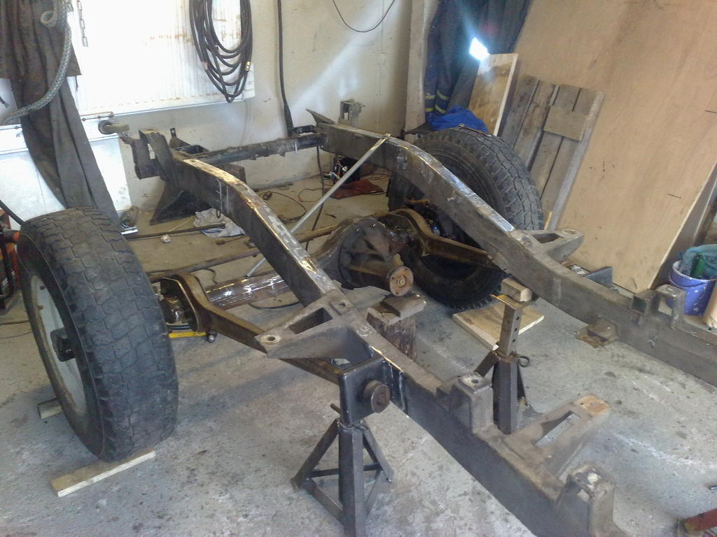 Jotain pientä nakerrellut taasen. Edestä puuttuu enää iskarit, jousen ohjaimet ja panhardi. Taka-akseli on vielä kokonaan hitsattujen putkenpätkien varassa, sinne pitäs raskia ostaa nelilinkki eväät (jos en laita rangen jakareita sinnekkin) Akseliväliä tällä hetkellä 2300mm eli 300mm jatkunut alkuperäisestä.