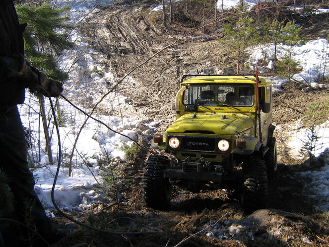 Auto ja tiimi toimi loistavasti. Kiitokset Eetzalle, Jannelle ja Tuomolle apparina olosta ja Tapsa4x4lle kyydityksistä(ainoa E kortillinen). Tuulilasi pamahti melkosenmonesta kohtaa halki kun pakittaessa karmi hölppäsi jostain puun kyljestä kiinni. Ajattelin että voisin kiinnittää karmin turvakaariin kuten vaikka iirosika omasa bj-73ssa mutta pitäskähän laittaa se kuitenkin jollain joustokumilla tms. kii että sallis pientä liikettä? Takalevikkeet karsiutui perinteisesti ja edestä kuskin puolelta kuului välillä mielenkiintoista naputusta mutta muuten ei ollut ongelmia. Täytyy vaan vähän taas noita syöttöjä yms. säädellä että saa hörskötystä eliminoitua ja tyhjäkäyntiä pienemmälle. Jare, Tare ja Mika järjesti mukavan piknikin bjn konepellille. Oli pöytäliinaa, kynttilää ja viiniä. Juustot ja daamit vaan puuttu:D http://forums.offipalsta.com/picture...ictureid=28070 Muutamia rastikuvia... Rasteja korkealla http://forums.offipalsta.com/picture...ictureid=28062 Tämä rasti meinattiin pumpata kun nähtiin miten Jarcan suskakin meni heti jäistä läpi. Sitten Tapsa4x4 ja Hokkanen sai meidät ylipuhuttua. Olin varma että persaukset kastuu mutta lattialla ei ollut vettä kuin alle nilkkoihin asti. Tais noi uudet ovet olla melkein tiiviit. Onneksi oli niin paljon omaa ja muittenkin narua että sai takavinssin vedon kallion päälle. http://forums.offipalsta.com/picture...ictureid=28063 50 pistettä. Hyvin kanto hetken jää bjn persausta. Takavinssin hölläys sitten aiheuttikin tykytystä kun rupes meneen jäästä läpi. Ei tiennyt yhtään että jos jossain on äkkisyvää. http://forums.offipalsta.com/picture...ictureid=28064 40 pisteen ränni. Tässä vieressä olevalla rastilla oli hilkulla ettei bj kaatunut kyljelleen ojaan kun luisti penkan päältä alas. http://forums.offipalsta.com/picture...ictureid=28065 Tässä se EI AUTOILLE rasti. Tarkoitus oli tynnyrin päällä ratsastaa rastille asti ja ottaa kuva kun kosketetaan tynnyrii ja rastia. Ei tainnut monikaan pysyy tynnyrin päällä kovinkaan kauaa ja uintireissuksi meni. http://forums.offipalsta.com/picture...ictureid=28066 No Eetzalla ei ollut märkäpuku turhaan päällä. Oli kuulemma kohtuu kylmää vettä:D http://forums.offipalsta.com/picture...ictureid=28067 Sarjassamme onneksi jää kesti. http://forums.offipalsta.com/picture...ictureid=28061 Maksimivenytyksiä riitti http://forums.offipalsta.com/picture...ictureid=28068 Nippa nappa saatiin tämäkin kivikkorasti otettua. http://forums.offipalsta.com/picture...ictureid=28060 |