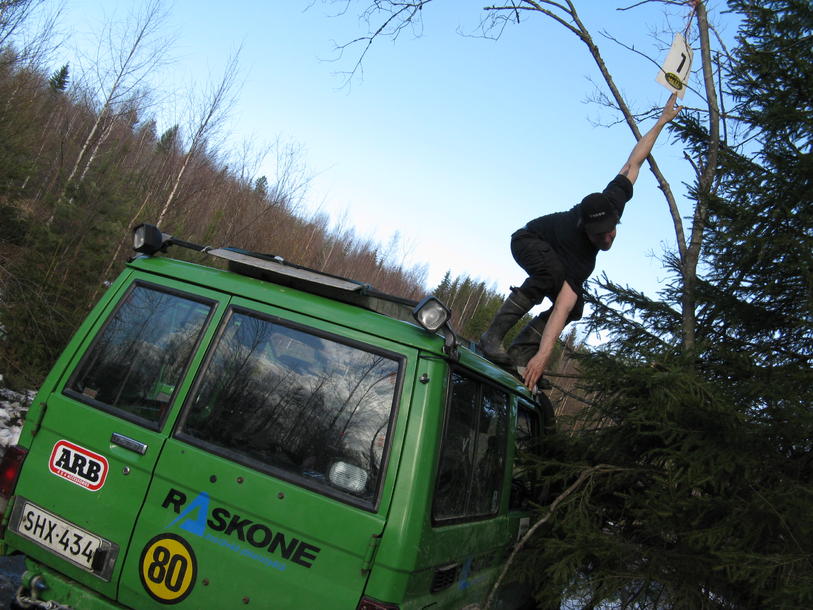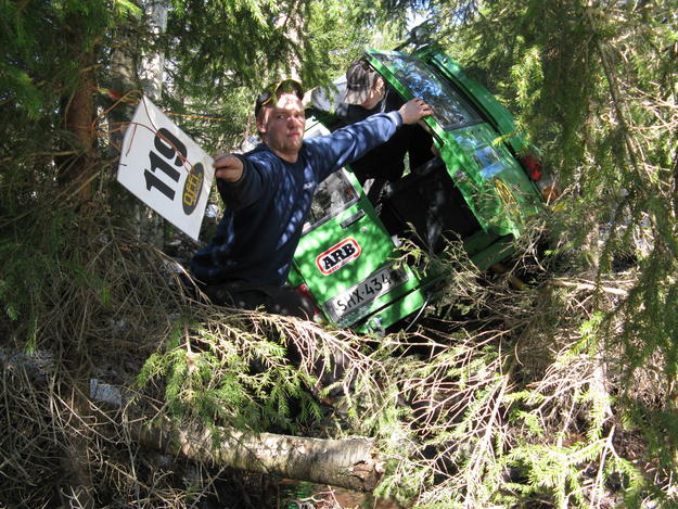 Meillä alko kanssa kisa vauhdikaasti kolmannelta rastilta tultiin jo pois kun oltiin saatu rasti, niin tuli perutettua ison järkäleen päälle ja siinä sit jonkun aikaan killuttiiin ja tietenkin etu renkaasta lähti samalla ilmat pihalle ja ei muuta kuin startti pilotti esille että saatin pyörä paikalle ja ilmat sisään. Kerettiiin ajaa pari tuntia kun tuli seuraava ongelma ja se johtu ihan siitä että auto piti ihan väkisin käydä uittaa lutakossa niin meni jäähdyttäjän flekti rikki ja rupes moottori käymään kuumana josta seuras taas seuraava ongelma eli automaatin ölyt kiehati ja meno tyssäs siihen. Kerettiin kuitenkin ajaa noin 4h ja satiin 920 pistettä niin sano rodeo driver on muuten hyvä suunnistus ohjelma että kiitos Jappe.