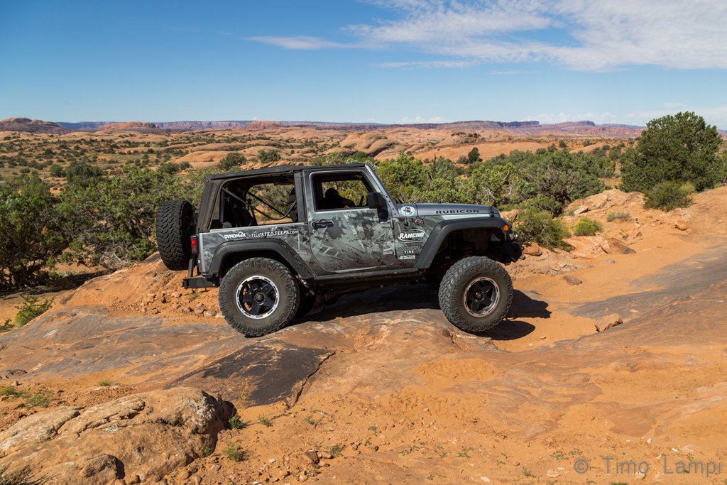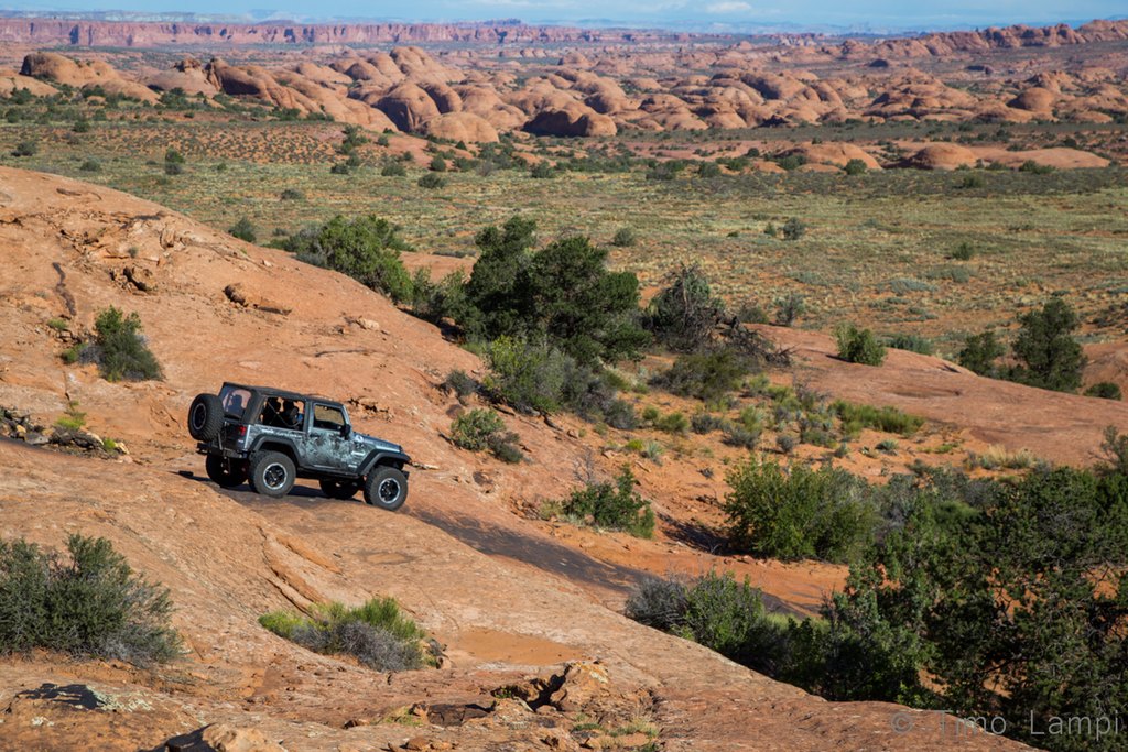 Nyt tiedän miksi Moab:ia sanotaan offaajan paratiisiksi - ainakin jos tykkää kalliokikkailusta. Uskomaton paikka, ja tuli sentään ajettua reiteistä vain Fins 'n Things (vaikeustaso 4/10). Hell's Revenge olisi tullut myös kokeiltua, mutta ei ollut ketään maisemissa ja sinne ei ihan yksin uskaltanut lähteä :D Yhden luonnonpuiston läpi ajettiin myös, ja sieltä alas kapeimmillaan kolmisen metriä leveää huonoa hiekkatietä josta vieressä parinsadan metrin pystysuora tiputus (ei kaiteita). Hieno tienpätkä.