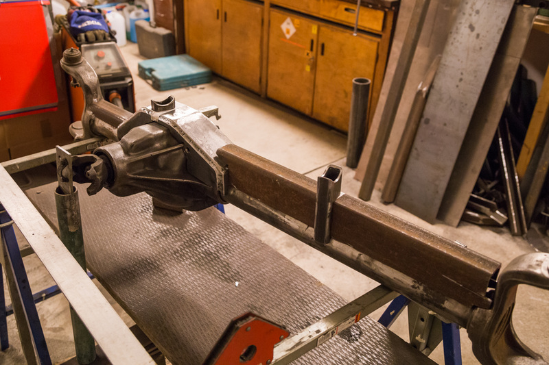 Vielä puuttuu hitsattavista kikkareista iskarin kiinnikkeet ja kallistuksenvakaajan kiinnikkeet, mutta ei uskalla hitsata niitä ennenkuin on akseli auton alla kiinni. Tuolla on niin pienet toleranssit että pahimmillaan - vai parhaimmillaan - pelivaraa on sentin verran :D