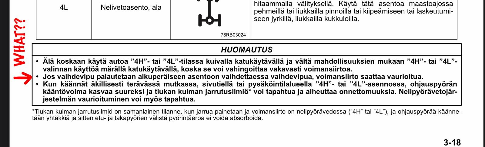 "If the transfer lever is returned to the original position while shifting the transfer lever, the drive train may be damaged ." "Do not shift the transfer lever while the rear tyre is spinning." Ja tosiaan tuo "transfer lever" on se lyhyt keppi, jolla valitaan vetotapa. Mutuna veikkaan, että tuo eka voisi tarkoittaa, että pitää odottaa sitä vetotavan muuttumista kepin uutta asentoa vastaavaksi ennen kepin uutta siirtelyä (pienellä viiveellä äänimerkki ja/tai nelivedon merkkivalon syttyminen/sammuminen). Ja tuo jälkimmäinen voisi olla tosiaan kuten tuossa jo arveltiinkin esim. tilanne, jossa takavedolla jää sutimaan paikalleen, niin silloin ei saa vaihtaa lennosta nelivedolle. Tämäkin mutuna. :D Ainakin tuolta löytyy jonkun jemmaamana enkunkielisenä: https://www.dropbox.com/s/vefvect5he...anual.pdf?dl=0 |