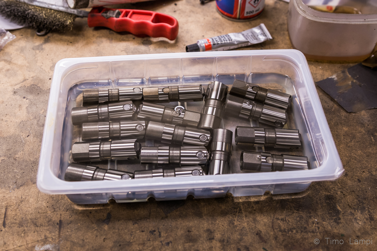 Kone kävi ylhäällä ja GT Motor hoiti nokkalaakereiden vaihdon hyvinkin kohtuulliseen 160€ kokonaishintaan. Laakerit on Cleviten alumiiniset, hinta oli huimaavat 37,50€/ sarja :D