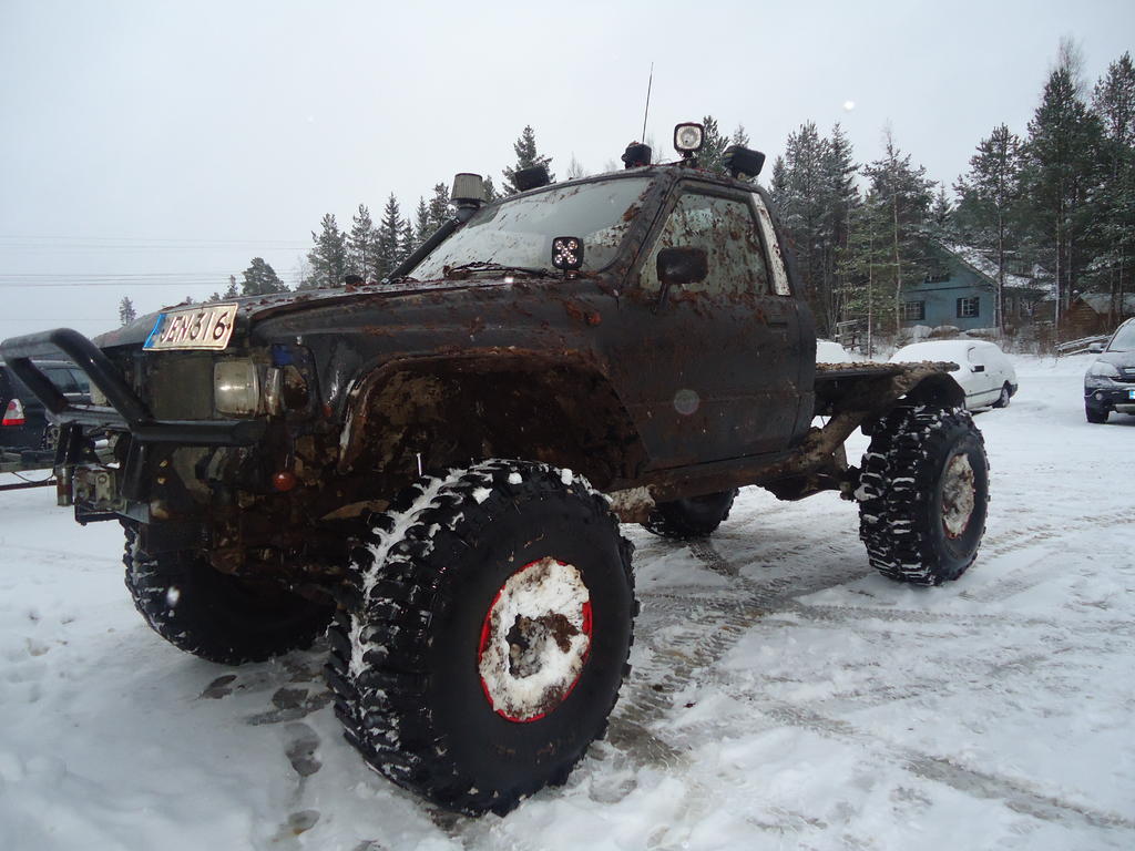 Nonniin... Täälläkin päin on saatu jotain aikaiseksi. Eilen laitettiin j1s:n kanssa kiristetty kitkalukko eteen ja taakse palalukko. Samalla etukardaanista korjattiin tuplanivel ja vaihdettiin yksi uusi ristikko. Meno parani kummasti noiden lukkojen ansiosta. Seuraavana vuorossa takaiskareiden kiinnikkeiden muokkaaminen, snorkkelin asennus ja vinssin hommaaminen.