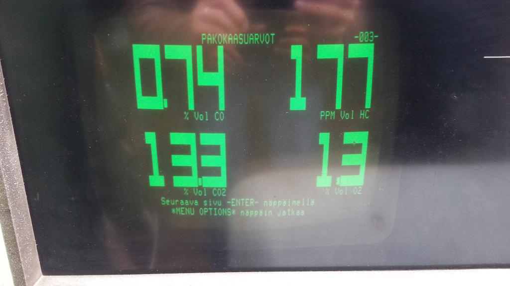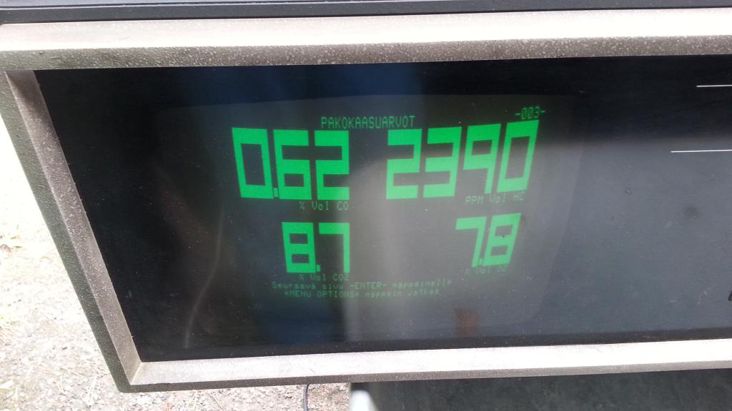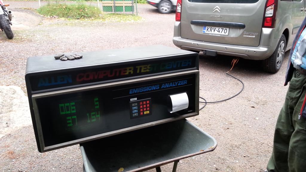 Säätäjä_setä on tässä kuukaudenpäivät entisöinyt ja kunnostellut uutta mittaria kokoelmassaan, kyseessähän on Allen 53-700P ETA, eli tuttavallisemmin pakokaasutesteri. Masiina oli melkoisen huonossa hapessa ostohetkellä: Happianturi hajonnut laitteen sisuksiin, peltejä ihan solmussa, sisukset paksun korjaamopölyn peitossa, kaikki letkut täynnä öljyä ja niin edelleen. Ahkera mittariharrastajamme kuitenkin purki laitteen osiin, pesi mittakammiot, vaihtoi letkut, sekä happianturin ja puhdisti kaikki mahdolliset. Tilasin kalibrointikaasua, happianturin sekä uusia filttereitä saksan ebaysta ja Säätäjä_setä sai laitteen kalibroitua. Testaittiin tuossa torstaina ja voin sanoa, että lopputulos on priimaa:cool: Ainoa miinus on, että laatikko on ihan julmetun kokoinen:eek: http://forums.offipalsta.com/attachm...5&d=1379707477 Tämä on Ameriikkaa:D http://forums.offipalsta.com/attachm...8&d=1379707477 Sävelletty imuputki, kun virallinen versio oli testauksen ajaksi unohtunut puuhamaahan. Testauksessa käytettiin kaikenlaisia härveleitä Suzukista, Yamahan motskariin ja Dieseli perslingosta Jeep Patriottiin, hyvin tuntuu toimivan:cool: http://forums.offipalsta.com/attachm...4&d=1379707477 Valkuaisen arvot on ruiskun laiton jälkeen ollu kohillaan, mutta avarrettu pakoputki aiheuttaa ylimääräisen hapen ilmenemistä. Tässä hieman rukkasella peitettynä laskee happi sallitun tason allle, muuten olisi yli 5. http://forums.offipalsta.com/attachm...6&d=1379707477 Muumipeikon Yamahassa tyhjäkäynnillä ainakin kone saa tarpeeksi bensaa:D http://forums.offipalsta.com/attachm...7&d=1379707477 Muzin henkilöauto Jeep menee nollat taulussa, ensireaktio oli, että onko mittarissa vikaa, mutta kyllä se noin vaan menee |