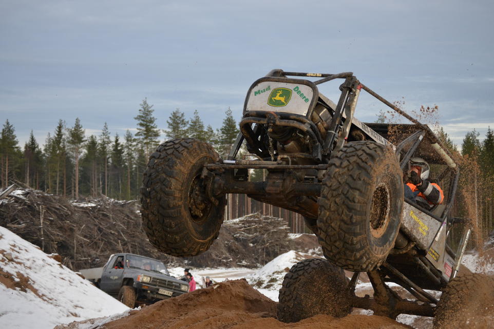 Tuo monttu vaan jotenkin sopii autolle ja tuntu, että joka paikan pääsee ajamalla, kun vaan muistaa laittaa nelivedon päälle. Tai vinssattiinhan me kerran omaakin autoa siellä kurakossa. Päivän kovin suoritus taisi olla nelospätkän portin kierto, jossa SL väitti beadlockin olleen maata vasten alarinteen puolella. Tiedä häntä, mutta oli se vähän kallellaan. Saatiin me päivän vinssauspalkintokin, siitä otettiin oikeen kuvakin? Ehkä toistakymmentä kertaa vinssattiin tai hinattiin muita. Saihan siinä samalla käyttää konetta, että hämähäkinseitit lähti pakoputkesta. Ja ostinhan mä joltain vetarinkin? Jos sattuu lukemaan tätä, niin vois vaikka privaviestin heittää? |