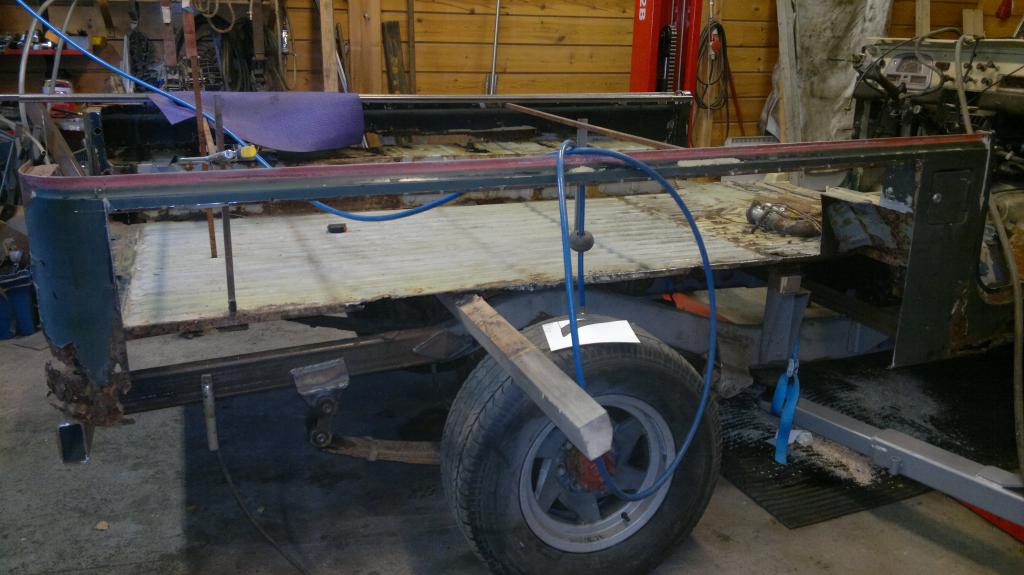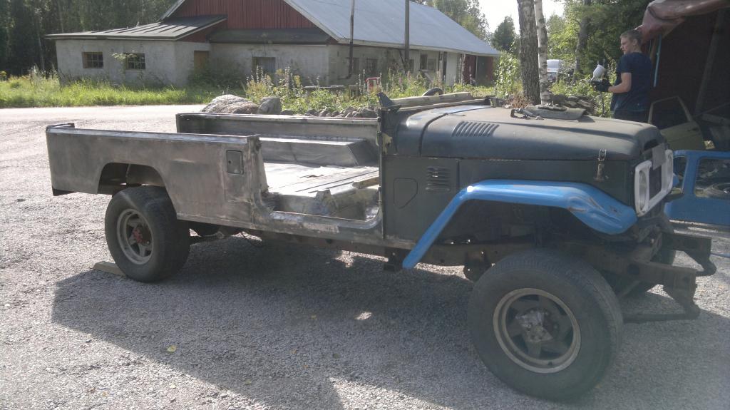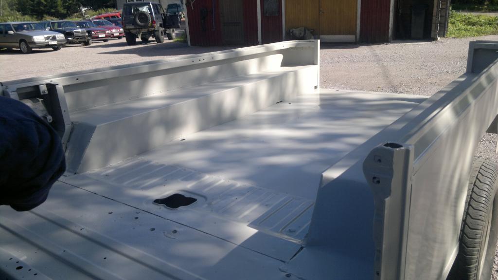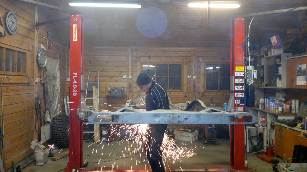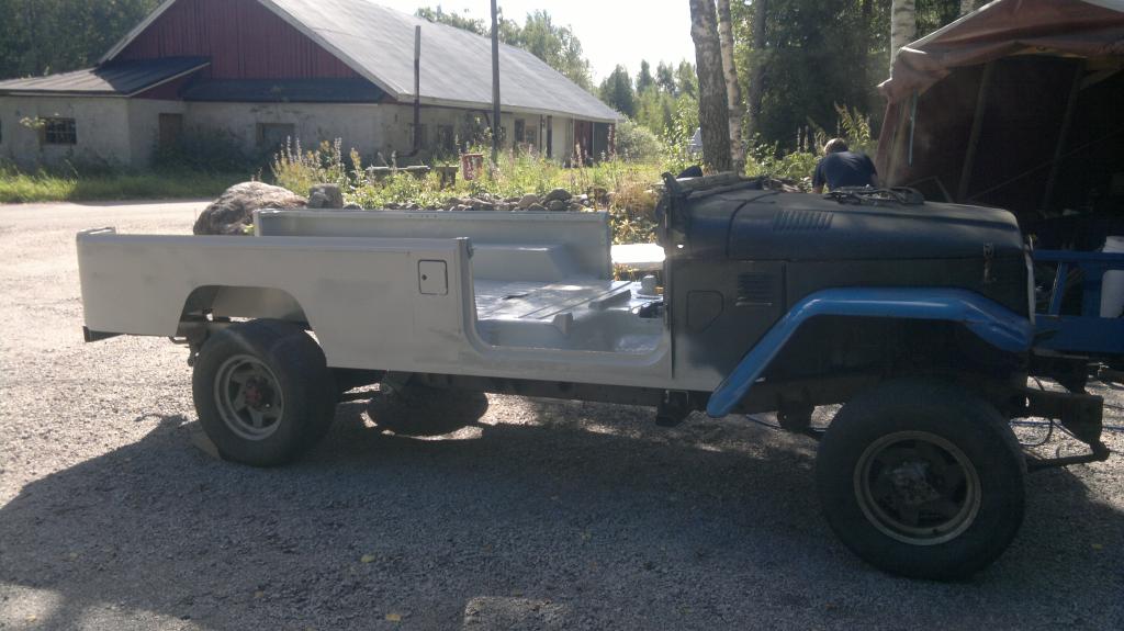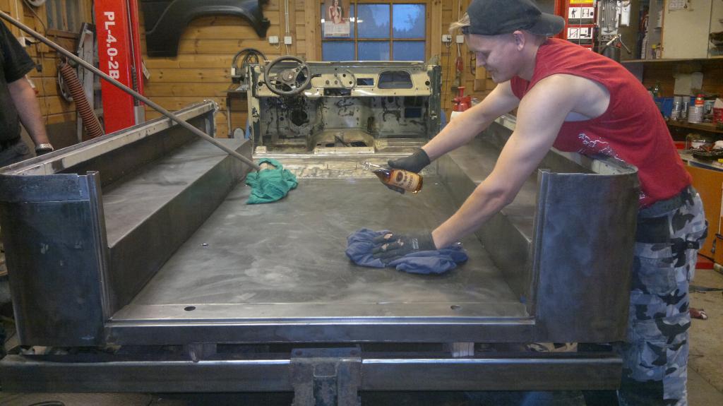 Edellisistä osista kun maali kuivui, siirrettiin ne sivuun ja auto tönättiin sisään monikäyttö Lj:llä. http://forums.offipalsta.com/picture...ctureid=188830 http://forums.offipalsta.com/picture...ctureid=188832 Koppa irti ja muutamia tunteja teräsharja laikkaa runkoon. http://forums.offipalsta.com/picture...ctureid=188828 Niin ja laitoin siinä iskunvaimentimet paikoilleen, tai siis niiden korvat ja kiinnikkeet. Vaihdelaatikon taakse nysäsin irroitettavan poikki palkin. Sitten muutama hetki sutien pohjamaalia. Ai ai alkaa näyttämään hyvältä. http://forums.offipalsta.com/picture...ctureid=188829 http://forums.offipalsta.com/picture...ctureid=188827 Nyt on tarkoitus pyöräyttää hytti ympäri että saadaan pohja hiottua ja hitsattua joitakin kohtia. |