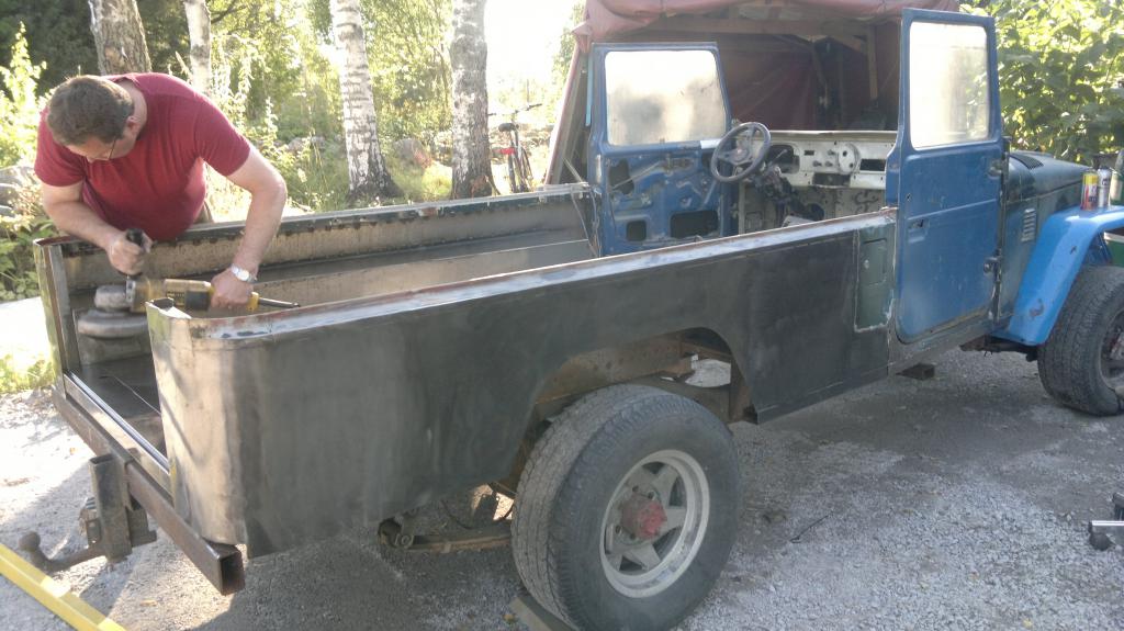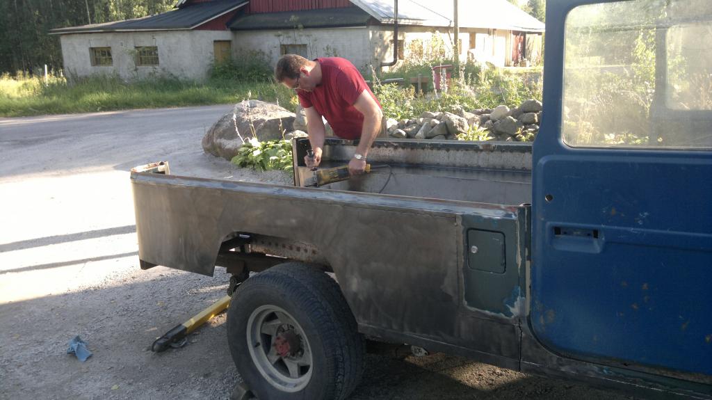 Perjantaina oli töistä vapaata ja jotenki sain pienen innostuksen joten kaivelin bj:n pressun alta. Jolulukuussa se tyrkättiin tallista pihalle kun oli muitten autojen remonttia. Yllättävän vähän oli ruostunut, pellit on kuitenki maalattomia suoraan hitsauksen jäljiltä. No johonkin sooda tms. puhallukseen kori olisi tarkoitus kiikuttaa jahka valmistuis joskus. http://forums.offipalsta.com/picture...ctureid=151029 http://forums.offipalsta.com/picture...ctureid=151030 Kuskinpuoli neppailtiin tänään kasaan tai no melkein. http://forums.offipalsta.com/picture...ctureid=151033 Helmaan putkiloa kun jäis vähä noloks jos olis pelkkä pellin reuna tosa. Sitte hoksasin että eikös tuola lokarin sisällä ollu alunperinkin jotai laatikoita. Etupäähän nyt ainakin tehtiin jonkinlainen kotilo, saa sinne ny ainakin 8-päkin kaljaa tungettua. http://forums.offipalsta.com/picture...ctureid=151031 Laatikon toinen seinä moudostaa "pyörän kaaren" toisen laidan ja takakulman laatikon seinä toisen laidan. Pieni innostus on taas tämän nysväykseen mjutta se saattaa hävitä yhtä nopeasti kun se tulikin. |