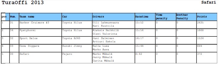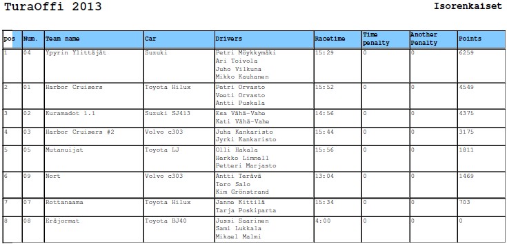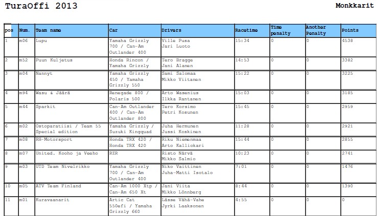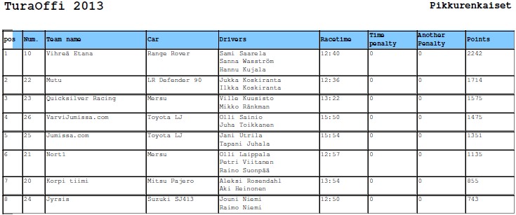 Kisakeskuksessa mahdollisuus ostaa (rajoitettu erä) Turaoffi 2013 t-paitoja á 15€ . Väri musta ja pitäis olla isoakin kokoa. Alla päivitetty lista ilmoittautuneista ,kopsattuna etusivulta. Pikku luokka: Korpi tiimi. Aleksi Rosendahl. Aki Heinonen ja Taavi Varjonen. Mitsu Pajero. Nort1. Olli Laippala. Petri Viitanen ja Raino Suonpää. Mersu. Team Mutu. Jukka Koskiranta. Ilkka Koskiranta. LR Defender 90. Iso luokka: Harbor Cruisers. Petri Orvasto. Veeti Orvasto ja Antti Puskala. Toyota Hilux. Kuramadot 1.1 Esa Vähä-Vahe. Kati Vähä-Vahe. Suzuki SJ413. Harbor Cruisers #2. Juha Kankaristo. Jyrki Kankaristo. Volvo c303 Ypyrin ylittäjät. Petri Möykkymäki. Ari Toivola, Juha Vilkuna ja Tomi Maartonen. Suzuki SJ413 Mutanuijat. Olli Hakala. Herkko Limnell ja Petteri Marjasto. Toyota LJ. Kuramadot 1.2 Mika Takala. Pia Takala. Range Rover. Team Rottanaama. Janne Kittilä. Tarja Poskiparta. Toyota Hilux. Safari: Team Safari. Mäkelä Marko. Jerry Mäkelä ja Carita Mäkelä. Pajero. Harbor Cruisers #3. Lehmusvaara Olli. Kuuttila Kari. Toyota Hilux. Sports delos. Salminen Jani. Eskola Artturi. Toyota BJ 40. Mönkijät (2 mönkijää per tiimi): (Tiimi, Kuljettaja 1. Ajoneuvo 1. Kuljettaja 2. Ajoneuvo 2.) United. Kooho ja Veeho. Risto Närvä. RZR. Ostoparatiisi/Team 55 special edition. Juha Hermunen. Yamaha Grizzly. Jani Lehtonen. Suzuki Kingquad. Team Kuravaanarit. Lasse Vähä-Vahe. Arctic Cat 550efi. Jyrki Laaksonen. Yamaha Grizzly 660. Lupu. Pusa Ville. Yamaha Grizzly 700. Luoto Jari. Can-Am Outlander 400. ATV Team Finland. Jani Viita. Can-Am 1000 Xtp. Mikko Lönnberg. Can-Am 650 Xt. Sparkit. Tero Korsimo. Can-Am Outlander 400. Petri Kosunen. Can-Am Outlander 800. |