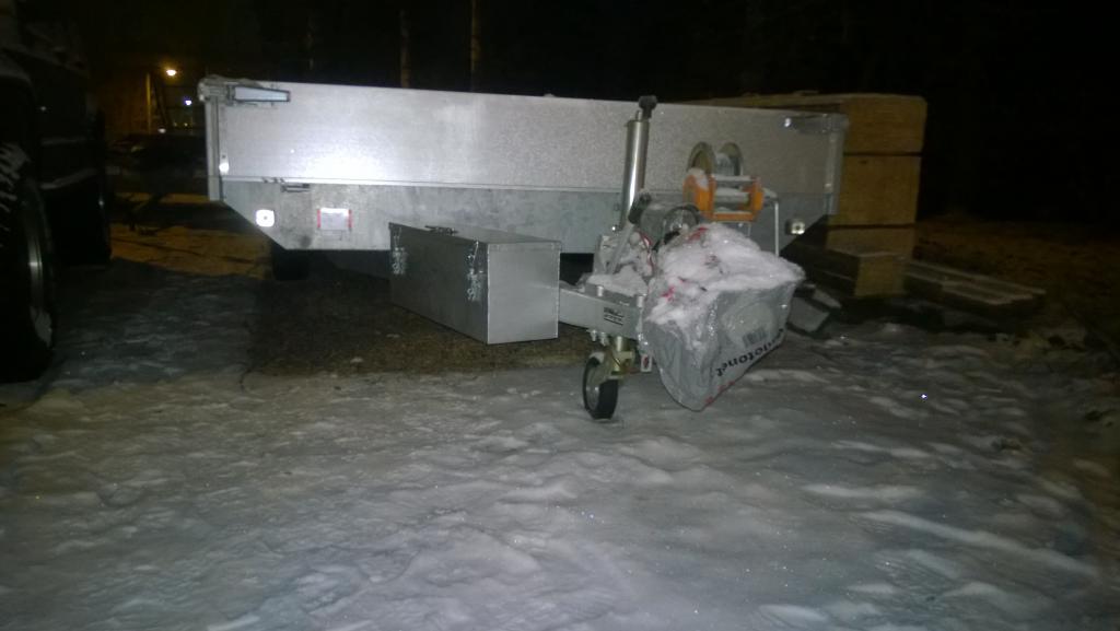 Tuli peräkärry hommattua ja siinä kun tukijalat, niin niiden veiville piti kärryyn saada paikka ja myös ajoramppien luukun avaimelle. Liinat tietty kanssa olisi hyvä saada kulkemaan kärryn mukana. Eipä muuta kun laatikkoa tekemään, kun ei sopivaa valmista löytynyt. http://forums.offipalsta.com/picture...ctureid=168564 http://forums.offipalsta.com/picture...ctureid=168565 Tuntui, että hyvä tuli, vaikka ehkä ois tarvinnutkin jonkun kevyen rungon, hitsaillessa tietty pellit sen verran veteli. Ei haitannut kuitenkaan toimintaa. http://forums.offipalsta.com/picture...ctureid=168566 Kiinnityksen olin suunnitellut tämmöiseksi. Yksi pultti laatikosta läpi, kun aisassa oli valmiina yksi reikä ja sitten tuommoiset puristuskiinnitykset lisäksi. http://forums.offipalsta.com/picture...ctureid=168567 Aivan helvetin hyvä tuli muuten, mutta kiinnityksen jälkeen kantta ei saa kiinni kuin kuminuijalla, kun se sen verran vääntää tuota takaseinää, missä saranat! :mad: Kai tääkin vielä pienellä kehityksellä hyväksi tulee... :o |
