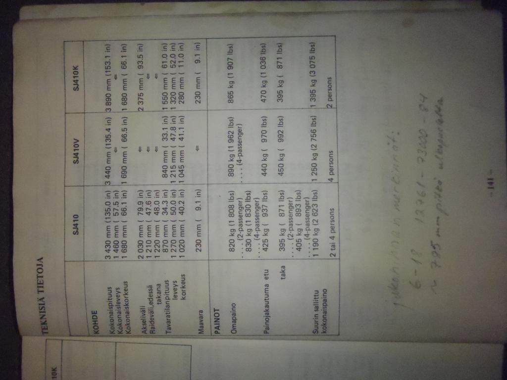 Suzuki sj:t kun sattuu olemaan samaa mallisarjaa kyseisten paperien mukaan... kaupallinen nimi voi olla samurai,Mutta mallimerkintähän on sj50v. Samoiten 410 on sj40v jne. |