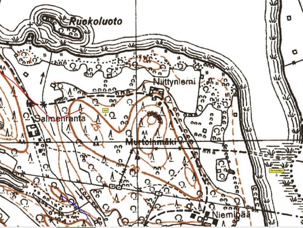 Nyt piirsin punaisella 1939 kartan ja sateliittikuvien mukaan kierron joka menee vanhoja teitä ja katkoviivoja pitkin. Reitti on varmasti ollut olemassa ainakin 40 luvulla koska siellä on Lehtola niminen talo. Tätä voisi koittaa ennen kuin loppuletka saapuu? Varmaankin ajettavissa koska välissä vain 1,5km tuntematonta ja loput näkyy satellittikuvista. Kiimasuon keskeltä menee läpi joku ura, talvitie? tai joku. Lisäksi 1:20000 kartassa suolla näkyy etelälaidassa katkoviiva joillekkin länteille, samoja länttejä keskellä suotakin, mitähän nämä on? Näyttäisi että keinokanava on kaivettu suolta joten sitä varmaan koitettu kuivata? Turpeen nosto? Rohkea reitti menisi siis sitä kautta suon yli? Anycase reitti tulee joka tapauksessa takaisin Hevossaareen lähelle kaislikon ylitystä ja siitä pääsee jatkamaan varsinaiselle pätkälle Kylä-Paakkolaan päin. https://forums.offipalsta.com/pictur...ctureid=208064 Tarkempi kartta https://forums.offipalsta.com/pictur...ctureid=208065 Sateliitti kuvissa "läntit" näkyy selvästi. https://forums.offipalsta.com/pictur...ctureid=208066 Vielä yksi vaihtari. Katkoviivaa suon laitaan ja talvitietä itäpuolta ylös kanavan yli? https://forums.offipalsta.com/pictur...ctureid=208067 |
