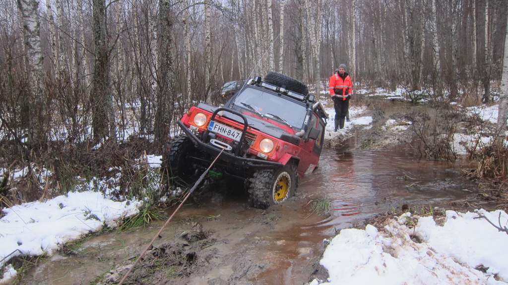 Aamulla nousin teltasta noin kymmenen aikaan, yllättäen ensimmäisenä. Puolijoukkue teltta oli yön aikana ilmestynyt viereen ja olin sen pystyttämisestä autuaan tietämätön. Keli oli lämmennyt ja teltassa oli kosteusprosentti kohdallaan. Makuupussi oli jo pinnasta märkä, ei auttanut, kun sulloa se sellaisenaan suojapussiinsa. Teltta meni sekin märkänä rullalle, tarkoitus oli yöpyä jatkossa PJ-teltassa. https://forums.offipalsta.com/pictur...ctureid=209221 https://forums.offipalsta.com/pictur...ctureid=209223 Aamupalaksi käristin nuotiolla pekonia ja kananmunia, niillä jaksaisi pitkälle iltaan. Aikamme arvottiin päivän reittiä ja päädyttiin siihen, että leiri jää paikalleen. Ilkka jää leiriin purkamaan mersua ja loput lähtee ajamaan lähistöllä olevaa suon kiertoa. Alkuun tavoiteltiin ajamattomalle reitille suon pohjoispuolelta mutta vanhaa uraa ei löytynyt. Oikeastaan luovutettiin liian helpolla, tukkitielle oli kaatunut iso kuusi, eikä jaksettu sitä sahata, kun tie meni muutenkin väärään suuntaan kartan mukaan. Otettiin suunta etelään ja kohti aikaisemmin ajettua reittiä. https://forums.offipalsta.com/pictur...ctureid=209227 https://forums.offipalsta.com/pictur...ctureid=209228 Metsätyöt olivat aiheuttaneet sen, ettei paikat olleet yhtään tutun näköisiä. Muistin hyvin tarkasti paikan josta vuosi pari sitten Kauko HZJ:lla yritti oikealle reitille, mutta vinssattiin takaisin, kun keula sukelsi ojaan. Sitten ajeltiin umpiryteikköjä pitkin erään talon raunioille. Yksi tavoite oli löytää tähän parempi vaihtoehto, eli alkuperäinen tieura. Muuttunut ympäristö ja harhaanjohtava GPS aiheuttivat sen, ettei pätkän alkua löytynyt. Tajusin vasta jonkin kilometrin päästä, että kartalle piirtyvä viiva ei vastaa todellisuutta. Auto oli paikallaan mutta kartan mukaan liikuttiin eteenpäin. Päätettiin lähteä hakemaan reittiä suon länsipuolelta niin ikään ajamattomilta katkoviivoilta. Heivasin huonosti toimivan Android tabletin ja nostin tilalle aikaisemmin käytössä olleen Windows tabletin. Tosin sekään ei ollut ongelmaton, kun USB portissa oleva GPS meni vähän väliä jumiin. Varmistuksena oli kännykässä OziExplorer ja se piirsi koko reissun virheetöntä reittiviivaa. Tonttilan Lasse, Ukkosen Kimmo ja Hattu-Vesku, alkoi pian kuulua LA puhelimesta. Jäätiin odottelemaan heitä Heinjoelta tulevan hiekkatien varteen. Letka saatiin kasaan ja jatkettiin kohti pohjoista. Reittiä ei tuntunut kovin helpolla löytyvän, joten jäätiin pitämään ruokataukoa niitylle. Niityltä koitettiin vielä hakea reittiä kohti alkuperäistä suuntaa mutta tuloksetta, edessä oli vain umpimetsää. https://forums.offipalsta.com/pictur...ctureid=209229 Ajettiin tietä pitkin vähän eteenpäin ja poikettiin metsään seuraavalle selvälle uralle. Ensimmäinen haara johti hakkuuaukealle, jälki kuitenkin katosi eikä lähdetty kannokkoon etsimään sitä. Valittiin seuraava ura, joka meni vähän pidemmälle mutta päättyi aukkoon sekin. Sateliittikuvista näki, että metsää olisi välissä vain sata metriä mutta niin tiheää ettei kannattaisi pimeässä yrittää. Koilisen suuntaan olisi myös ura, vieden aukealle, mutta mitään selvää määränpäätä ei ollut. Uusi suunnitelma, palataan takaisin paikkaan josta alkuperin ajettu viiva olisi lähtenyt. https://forums.offipalsta.com/pictur...ctureid=209231 Matkan varrella, paikallinen kuljettaja oli pulassa ylämäessä, vaikka takarenkaat oli varustettu ketjuilla. Tarjottiin apua mutta kertoi traktorin olevan jo matkalla. Auto oli betonilastissa, joten painoa saattoi olla jonkin verran. https://forums.offipalsta.com/pictur...ctureid=209232 https://forums.offipalsta.com/pictur...ctureid=209233 Saavuttuamme määränpäähän, latasin vanhan reitin Lassen koneelle ja hän lähti etsimään sitä. Huomasin että tulomatkalla käytössä olleen Android tabletin GPS oli seilannut ihan omilla laduillaan ja on selvää, että reitti alkaakin melkein sata metriä luultua aikaisemmin. Metsästä löytyi selkeä pehmeä ura, jota pitkin päästiin halutulle katkoviivatielle. Osa porukasta erkani letkasta ja palasi leiriin viemään Ilkalle varaosia. LA puhelimesta kuultiin pian, että leiriä kohti suuntaavasta letkasta "isokissa" Defender oli ojassa kyljellään, liekö tullut kuskille ohjausvirhe. Reitti nousi aavistuksen mäkeen ja pian edellä olevista autosta alkoi säntäillä miehistöä pihalle. Ensimmäisenä ollut Suzuki oli kyljellään jossain kuopassa. Lasse osui pimeässä niin syvään monttuun, että auto heilahti sen pohjalle kyljelleen, apukuskin puolelle tietenkin. https://forums.offipalsta.com/pictur...ctureid=209234 https://forums.offipalsta.com/pictur...ctureid=209235 Samu Hiluxilla koitti ajaa vasemmalta ohi mutta sielläkin oli vastassa monttu. Suzuki vinssattiin lopulta renkailleen, kun ensin oli otettu pari valokuvaa todistusaineistoksi. https://forums.offipalsta.com/pictur...ctureid=209236 https://forums.offipalsta.com/pictur...ctureid=209237 Suzuki ehti olla kyljellään niin kauan, että tulpat poistetiin ennen käynnistystä. Startatessa tulpan reistä roiskui öljyä monen metrin korkeuteen viereisen männyn kylkeen. Putsari otettiin irti ja imusarja oli vieläkin täynnä öljyä. Suurimmat määrät imeytettiin rätteihin ja suodatinta koitettiin pestä öljystä. https://forums.offipalsta.com/pictur...ctureid=209238 https://forums.offipalsta.com/pictur...ctureid=209239 https://forums.offipalsta.com/pictur...ctureid=209240 Lopulta uskallettiin lyödä romut nippuun ja kone tulille. Suzuki tupsutteli vähän öljyistä ja haisevaa pakokaasua mutta toimi kuitenkin. Päästiin vihdoin jatkamaan matkaa. Pian tavoitettiin Kuntola nimisen tiluksen rauniot, jossa aikaisemmin ajettu reitti yhtyi nykyiseen. Siitä eteenpäin päästiin kiimasuon laitaan melko tarkasti kartan viivaa pitkin ja edessä oli jo parempi tie. Karpalosuon kohdalta poikettiin metsään, hak