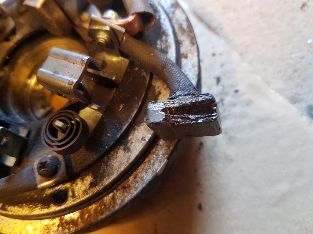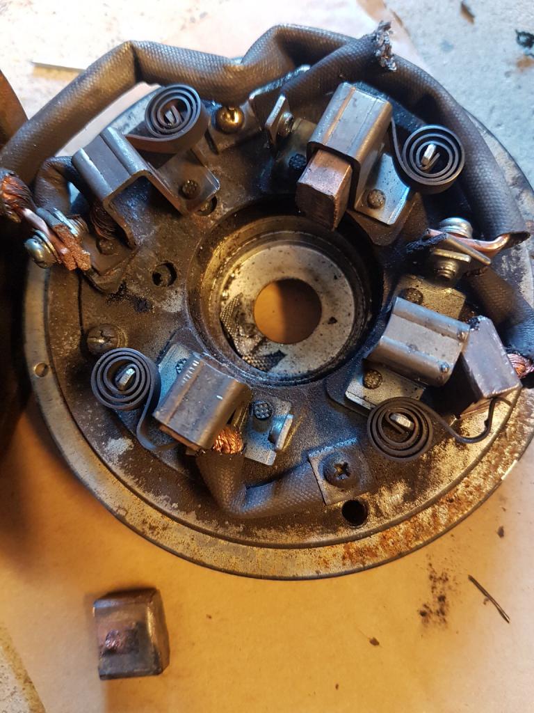 Eihän se vinssin moottori loppuun asti kestänyt vaan kyrvähti viimisenä päivänä helppoon vetoon. Alla kuvia sisukaluista, oma veikkaus että moottori niputettu väärin jo tehtalla koska tuo yks hiili hieman väärässä paikassa ja kaikki virta työnnetty vastakkaisesta hiilestä läpi jolloin jopa hiilen kotelon niitit sulaneet irti?