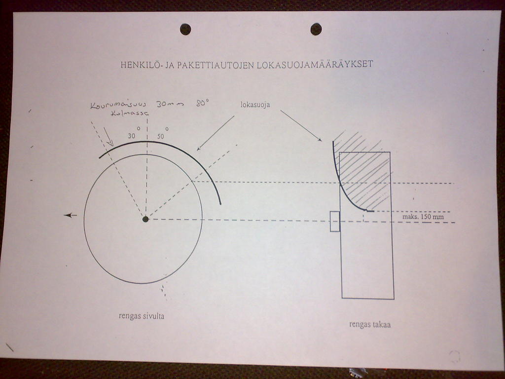 Lokasuojan pitää jatkua taaksepäin 50astetta pystylinjasta ja 150mm korkeudelle akselin tasosta. Paitsi jos tuota maastoajoneuvo-poikkeusta yritetään soveltaa, silti pyörien pitää olla aukoissa sisällä. Jos lokasuojaa jatketaan lopusta alaspäin roiskeläpällä tuohon 150mm rajaan asti, ei se välttämättä riitä kun sitä kourua ei ole. Tosin voi silti kelvata. Eli ne roiskeläpät ovat pakolliset, jos lokasuoja on liian lyhyt/korkealla? -74 Range, 215cid V8 #4x4@ircnet |
