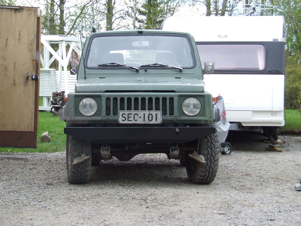 Jotain kerennyt vaihteeksi tekemään. Kantotutka, vanhat valot ja puskuri sai väistyä. Tilalle hieman paremmassa turvassa olevaa tavaraa. Laikat loppui rällystä kesken niin en saanut vanhoja puskurin/rekkarikilvenvalojen "kiinnitysrautoja" (lue ruosteita) ajeltua pois. Ja niiden tilalle tuleepi 100*50 rhs palkista puskuri. Ja kuvakin löytyy (ei saa nauraa)