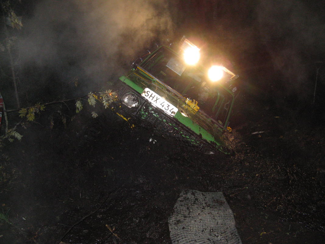 Kiitos ja kumarrus järjestäjille ja maanomistajille. Mukavaa oli taas kerran vaikka vastoin käymisiäkin oli tällä kertaa mm. yksi murros paukahti ja samalla teloi napalukon halki. Kerran karkasi etuvinssin vaijeri rummulta ja kaksi kertaa sammutettiin turve paloa moottoritilasta, onneksi sammu ihan paineilmalla ja rukkasilla niin ei tarttenut vaahtosammutin laukasta. Sitten oli moottorin ylikuumenemis ongelmaa muta uran jälkeen yhdessä vaiheessa hävis öljynpaineet mut se olikin onneksi vain joku kosketus vika sähköissä sitten uintirastien jälkeen ajateltiin heittää rukkaset naulaan vajaa pari tuntia etuajassa meinattiin kyllä käydä letrussa vielä mut rupes läjä hökimään sen verran että eipä viitsitty enää riskeerata kaiken lisäksi pakoputki hankasi etupyörään aina oikealle käännyttäessä. Suuret kiitokset purkkiorjille Petrille ja Pasille.