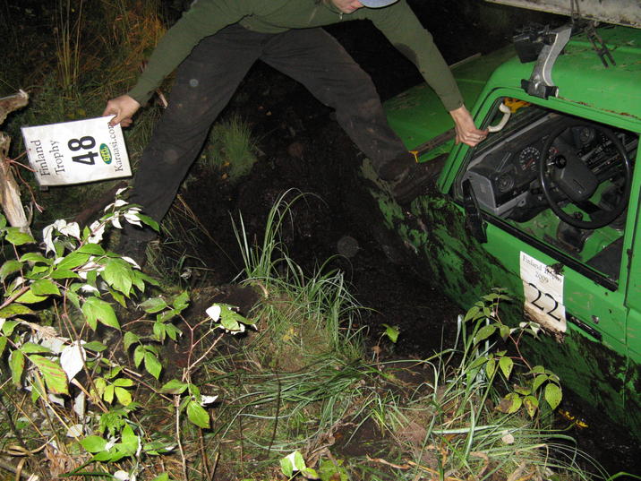 kisan alussa näytti jo huonolta kun joka paikkaan mihin mentiin juoduttiin jonottamaan aamu yöstä menetettiin rengas (pyöränpultit poikki) onneksi pienessä vaudissa ja kovallamaalla onnistuttiin vaihtamaan pultit ja ajettiin varmaan kilometri ja uudestaan poikki (ei enää niin kovalla maalla) tämäkin onnistuttiin korjaamaan metsässä , mutta käytiin tekemässä varma korjaus kisa keskuksessa. tässä vaiheessa oltiin varmoja ettei lähellekään kärkeä ole mahdollisuutta korjauksiin mennyt yli 4h lähettiin kuitenkin ajelemaan vielä kun aikaa oli reilusti. sitten siellä uimarasti alueella ( haettiin muuten kaikki 3 kosteaa ) meni vetari poikki kolme tuntia ennen ajan loppumista eikä ruvettu enää vaihtaa kun ajateltiin ettei olla kärkikahinoissa mukana, mikä oli virhe olettamus 2 sijaan 16p 1 vähän päälle 200 T. TEAM OFFROADTARVIKE |