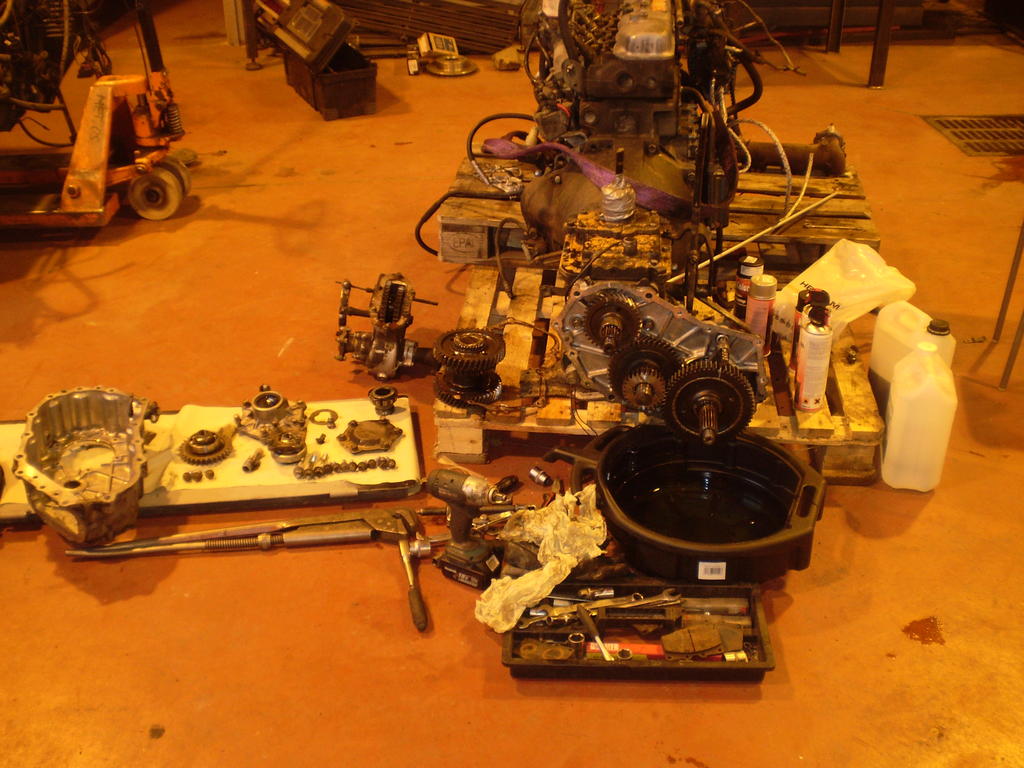 eipä täsä nyt oo mittää ihmeempiä saatu aikaseksi.. moottorin pulttailin irti ja kävin höyrypesemässä sen. samoten rungon pesin höyrypesulla ja se lähti puhalluksille. tänään sit ronklailin öljyputkia turvolle ja vaihtelin uudet jakolaatikon välitykset.. (omavalmisteiset tietenkin.. )