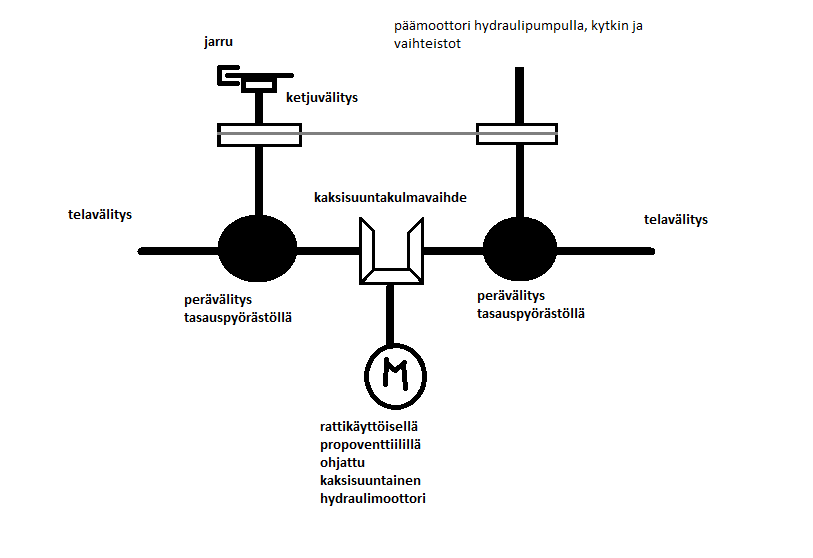 Oma Lada-konversio on jo palvellut seitsemisen vuotta. https://www.youtube.com/watch?v=I4LhrE2EDrI https://www.youtube.com/watch?v=Q2y__wMT1o4 https://www.youtube.com/watch?v=YpzIQbqcutc 2010 ja 2015 Koneviestissä löytyy kuvat. ________________________________________________ Nyt kaavailen telakopotinta tällaisella vs-ratkaisulla: Liite 66953 Etuja: -Ohjaus juoheaa. -Hyd.öljyt ei kuumene suorilla ajellen, kuten täyshydraulivoimansiirrossa. -Pyörii paikallaan. -Voi käyttää kierrätyshydrauliosia, kun ei kaikkea tarvitse pareittain. Miinuksia: -Perien tasausrattaat lujilla. -Ohjaus toimii takaraivon mukaan peruuttaessa väärinpäin. ? Perien kestoa ajatellen koneesta pitää tehdä hyvin pieni ja kevyt. Se on muutenkin päämääränä, pakettiautoon sopiva. Hyötyajoon ei tarvis saada. Pikkurattaiden laakereita voi joutua tekemään ja öljynkiertoa suihkuineen. Kahta identtistä erillisjousitetun lukotonta perää ja hydraulikimpuloita ois tarvis saada. Voimalaitoskin vielä arvoitus, ehkä kiinanmönkijän pata. Saa mokomia tarjota yv-postilootaan. |