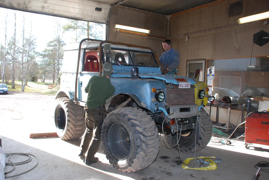 olitiin ramiD kanssa tienaamassa maakunnassa joten lähetin parhaan mieheni rauli(MITÄ NYT) ossille ehostamaan landmoggia. oli siellä' riehuttu hytistä oli muisto jäljellä ja pikkusen isommat tassut oli tullut. noilla oulaisiin täytyy sit mennä kun ossille aina tolkuttanut et lyhkänen akseli väli ja isot pyörät nyt on lyhyt ja isot pyörät! taitaa tulla sellanen suohiipiä et saadaan melua eteen päin oikein vetisessä paikassa??