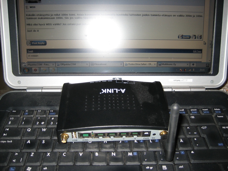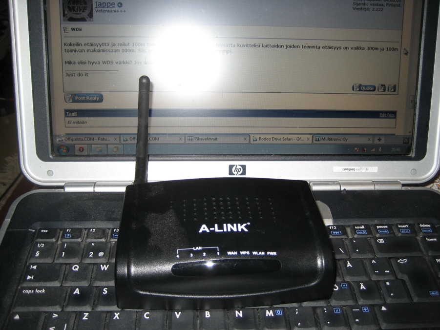 tuohon wds ajatukseen, olen värkänny pari wds verkkoa pystyyn buffalon purkeilla ja siihen kun lisää ison irto antennin niin jossain vaiheessa minulle liikkeessä sanottiin että tää on sitten laiton suomessa. vissiin lähtötehojen takia... joten olisko se sopiva yhdistelmä Offi hommiin... kuulostain laittoman mukavalta...