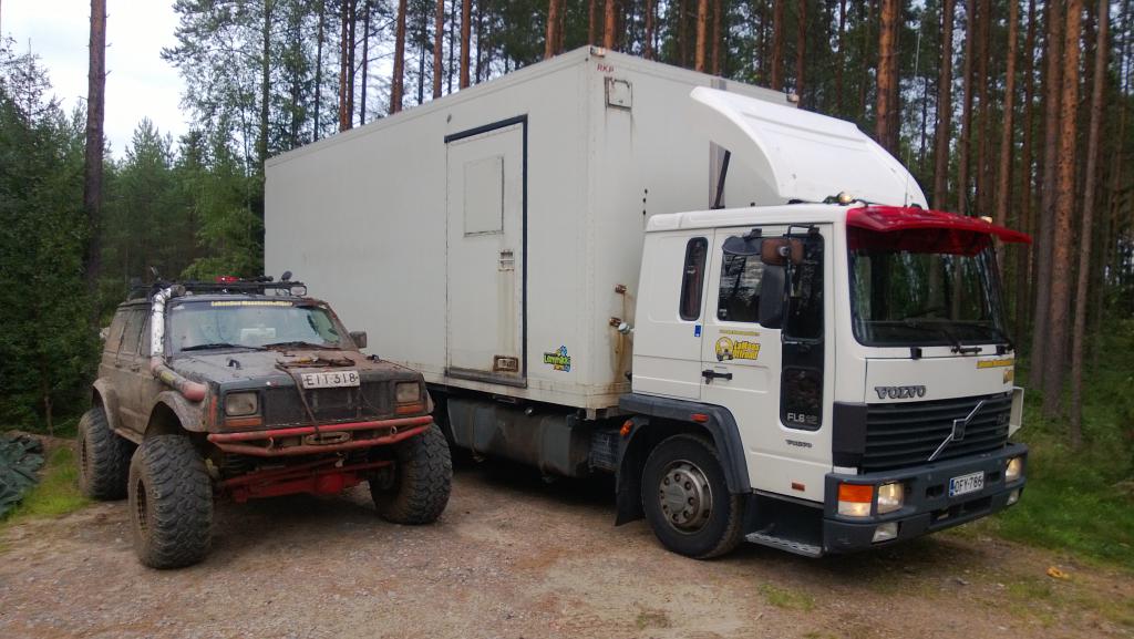 Mulla oli aluksi Range + traileri jolla kuljetin BJ:tä. Bensaa paloi semmonen 20l/ 100 km ja talvella oli tosi huono vetää vaikka oli nastat sekä rangessa että kärryssä. Sitten kun tuli BJ:hin isompaa rengasta ja leveempää akselia niin piti alkaa miettimään isompaa kuljetuspeliä. Kivisen kanssa sitten hommattiin Iveco 79-14 jossa oli kantavuus jotain 4-5 t ja siina oli iso lava ja perälautanostin. Toi perälautanostin toimi hyvin ramppina eli sai auton nopeesti kyytiin. Iveco oli aika iso nurkissa pyörimiseen ja ohjaamokin oli pieni eli sinne ei mahtunut kun ukot kyytiin. Iveco vaihtui sitten 609 mersuun miehistöhytillä ja pieni nostin oli lavalla. Ton kokoseen peliin mahtuu hyvin työkalut ym varaosat kyytiin sisälle. Lava ja kantavuus oli just passeli BJ:lle, isompaa/painavampaa autoa ei oikein pysty laillisesti kuskaa. Ton kokoisella kuorkilla pystyy ajelee ihan hyvin normaalissakin liikenteessä. Mahtuu parkkiruutuun just. Ja jos on vähänkin muutakin käyttöä kun auton kuskausta niin kannattaa ehdottomasti hommaa kuorkki. Itelläkin säästy aika mukavasti kuljetuskuluja talon rakennuksessa kun itse kuskasin melkein kaikki tarvittavat kamat.