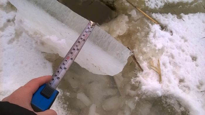 Vaan eti semmonen reitti missä on koko matkalta tuon verran. Kuolimolta tuli viestiä että siellä on saman suuntaisia lukemia mutta on myös alue missä jäätä on vain 10 senttiä.
