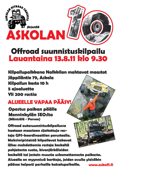 Meillä on ilo ilmoittaa että Askolan offroad yhdistys järjestää Askolan Kymppi Offroad suunnistuskilpailun 13.08.11. Kilpailun kesto 10h, paikkana Askola. Luokat: Orkkis, Stanu, Modi, Proto ja Kuorma-autot (muut ohjaukset myös sallittu, punakilpisyys minimi).