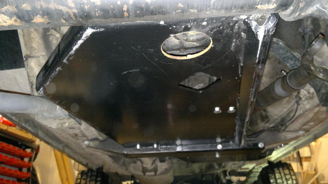 Samanen palkki hajos multa kunnolla kantoon ajon seurauksena. Palkin vääntymisestä seurasi lisäksi kaikkea vähemmän hauskaa, kuten esim. tämä: http://forums.offipalsta.com/showthread.php?t=78241 . Laitoin sen jälkeen tommosen itsetehdyn pultatun panssarin. Pelittää hyvin, eikä ole palkki enää ottanut kipeää. Pelti on sisäpuolelta vahvistettu kasalla vinottain pystyyn hitsattuja 3*12mm ripoja (kuten tarkkasilmäinen kardaaniaukon vierestä huomaa). Pelkkä 3mm vahvuinen levy ei riitä ottamaan vastaan kunnon tälliä. Etummaiset pultit on vedetty kiinni kierretapilla runkoon tehtyihin kierteisiin. Ohutta on juu, mutta palkki ottaa tällit vastaan ja etummaiset ruuvit vain estä ettei pelti tipu. :D
