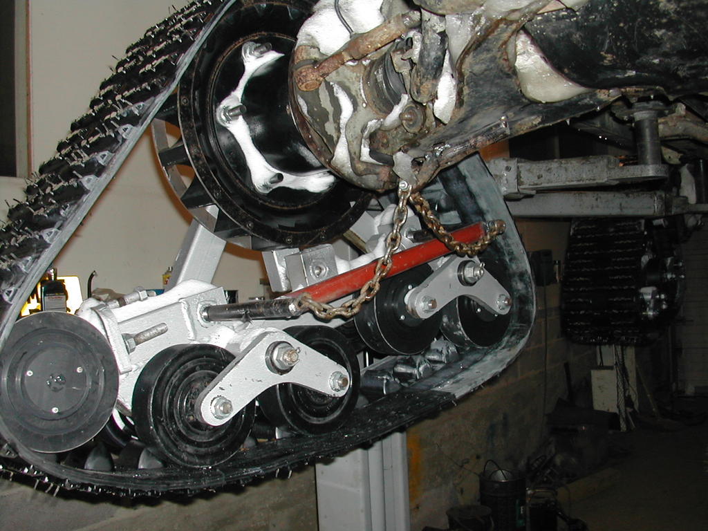 mattracksin teloissa on ympäripyörähtäminen estetty semmosel kumijoustosysteemil mistä menee tanko takatelassa alatukivarren pultin alle ja edessä yläpallo ja raidetangonpään kiinnityksiin.. näin siis noissa omissa mönkkärin teloissa.. ja maastoajelut kannattaa unohtaa ennenkuin estää tuon ympäripyörähtämisen..
