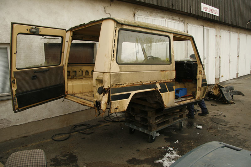 Autosta oli vuosien mittaan lainailtu kaikenlaisia varaosia mm. etuakseli, ja se oli muutenkin kunnoltaan Ö- Viime hetkellä huomattiin kuitenkin että yhteen toiseen runkoon on luvat V8 moottorille ja niinpä kyseinen runko otettiin työn alle. Runko on jo kelkottu verstaaseen sisälle, se oli Mersuille tyypilliseeen tapaan käytännössä ruosteeton mutta kamala rasva ja kuraläjä. http://forums.offipalsta.com/picture...ctureid=146348 Kori oli kohtuullisen pehmeä, ja siitä irrotettiin jo ulkona lähes kaikki mitä ruuveilla irtoaa. http://forums.offipalsta.com/picture...ctureid=146349 Peltitöitä on tiedossa runsaasti, tämä oli vielä oletettuakin happamampi. http://forums.offipalsta.com/picture...ctureid=146350 http://forums.offipalsta.com/picture...ctureid=146351 Lopulta perattu kori siirrettiin sisälle verstaaseen. http://forums.offipalsta.com/picture...ctureid=146352 Tästä on hyvä jatkaa rälläkällä ja plasmalla. |