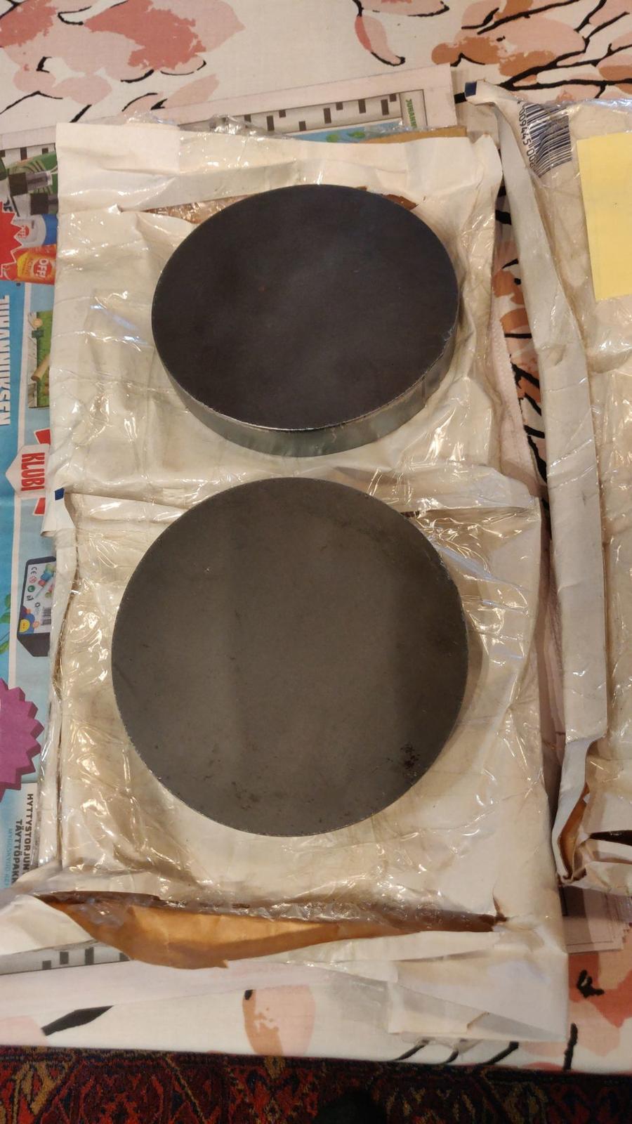 Veiressä referenssinä SSAB:n "mustasta" tavarasta tehty sovitinlaippa. Nämä vielä niinpäin, että pakassa öljyt pinnassa ja laippa sorvin jäljiltä. No ruosteet pois mitä lähti ja vanhat hyväksi koetut ruosteensuojaus konstit käyttöön. Huomaa termi ruosteensuojaus. Suojaamme siis ruostetta. https://forums.offipalsta.com/attach...1&d=1701978705 |