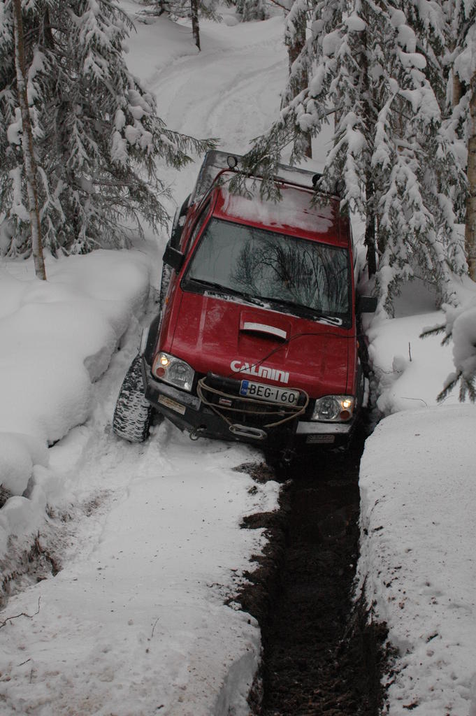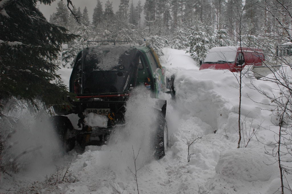 niin mä vähän epäilinkin...;) Tuskin kovin moni on raskinut tuollaista Calminin puskuria tilata jenkkilästä. Kinkyn hyvä eteneminen lumessa varmaan johtuu kohtalaisen sileästä pohjan muodosta...rojut on aika hyvin suojassa palkkien sisäpuolella...ja kun ei ole sellaista perinteistä akselia edessä (putki + murikka) niin lumi ei kasannu siihen eteen sellaiseksi tönkyräksi. Tietenkin hyvä kuski kruunaa toimivan kokonaisuuden ;)